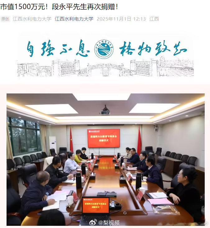 【段永平回应向江西水利电力大学捐股票】段永平回应捐赠茅台股票知名投资人段永平近日向江西水利电力大学教育发展基金会无偿捐赠其持有的贵州茅台股票壹万股(市值人民币1500万元),以父母名义设立教育专项基金。11月1日,段永平通过其雪球账号发文回应:“其实只是1万股茅台,他们每年花分红就好。市值只是暂时的。”(财联社)