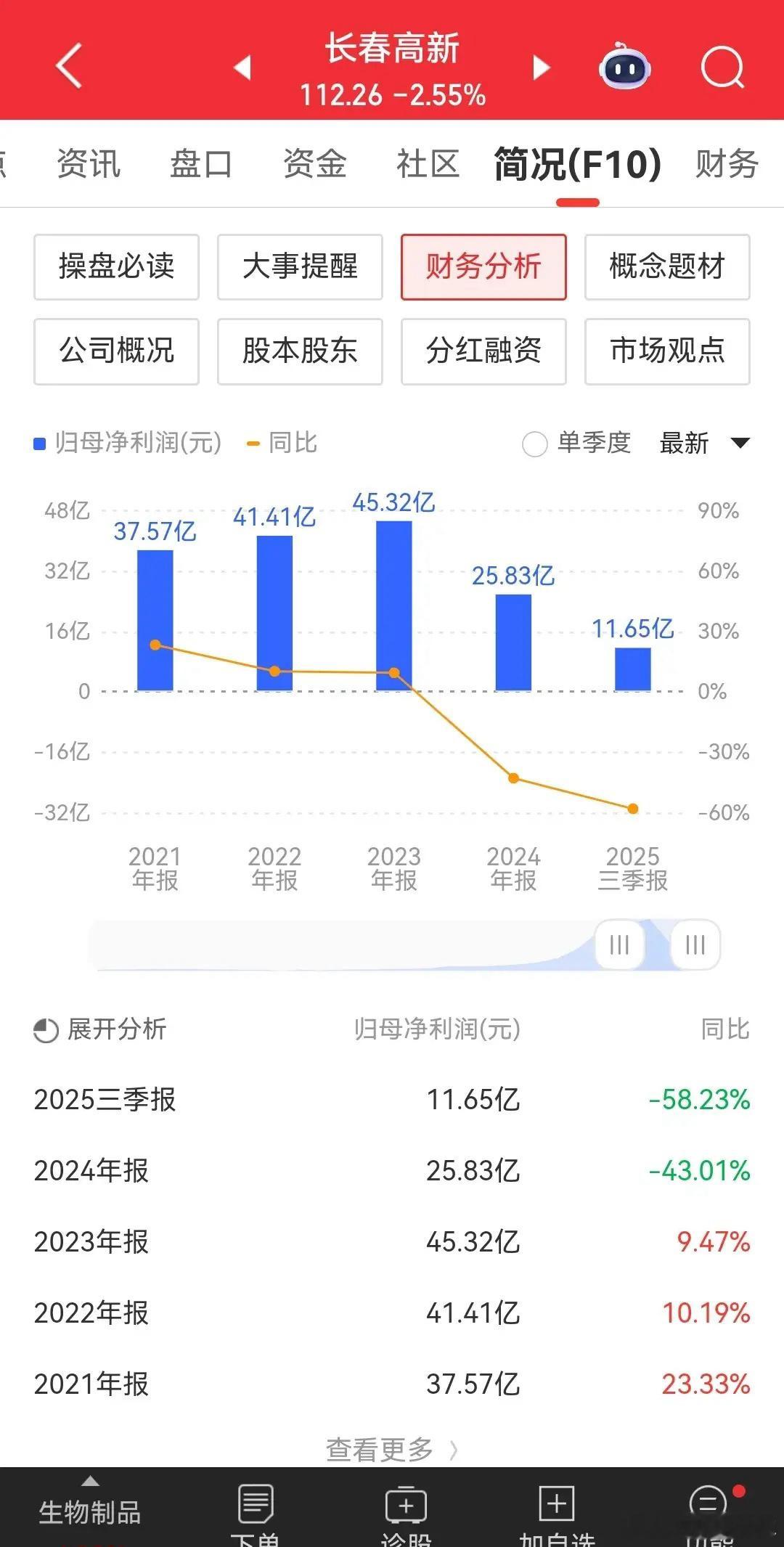 以长春高新为例,公司股价复权后历史最高价513.37元,最低跌到了74.94元,跌幅高达85%,如今股价也只有112元。最重要的是公司业绩开始大幅下滑,长春高新去年年报下降43.01%,今年三季报又下降了58.23%,业绩呈现恶化趋势,已经没有了成长和上涨的动力。