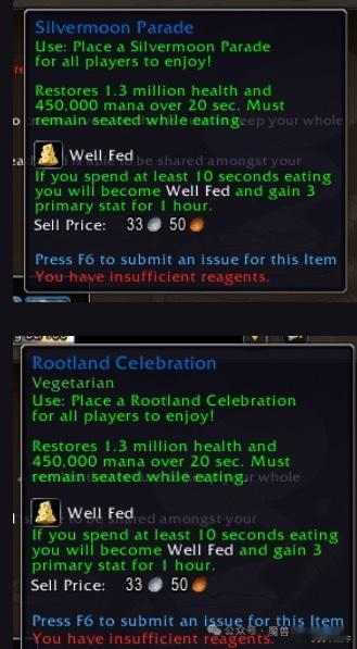 对比标注 “素食” 与 “非素食” 的盛宴属性可见,二者在属性加成上并无差异。