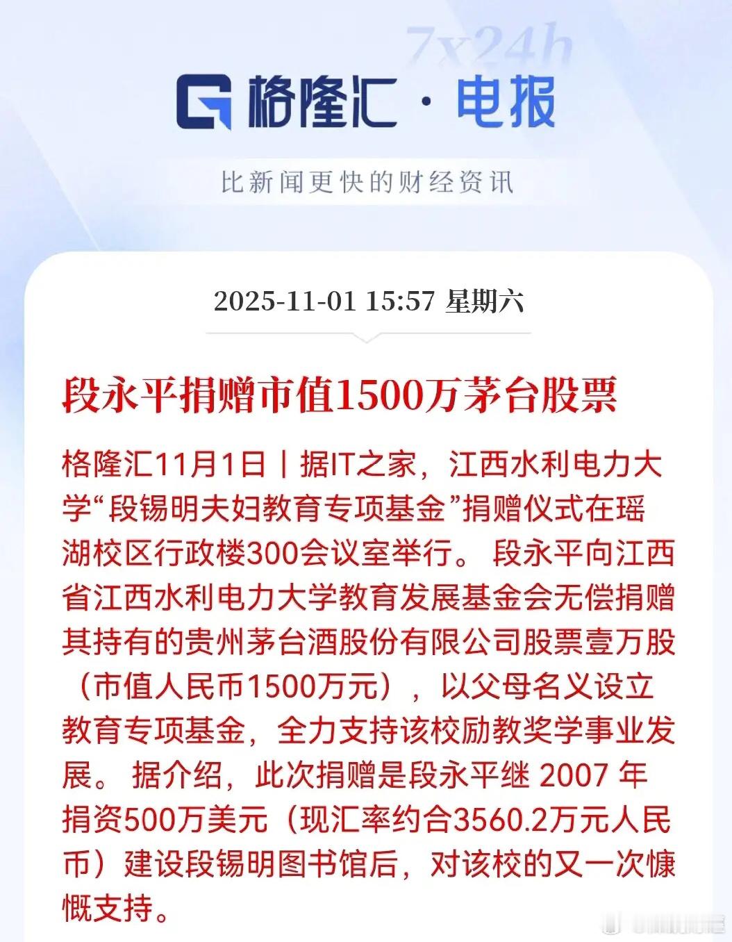 段永平这事儿干得真漂亮!直接拿出价值1500万的茅台股票,捐给江西水利电力大学,还是用父母名义设立教育基金,这份心意太暖了!