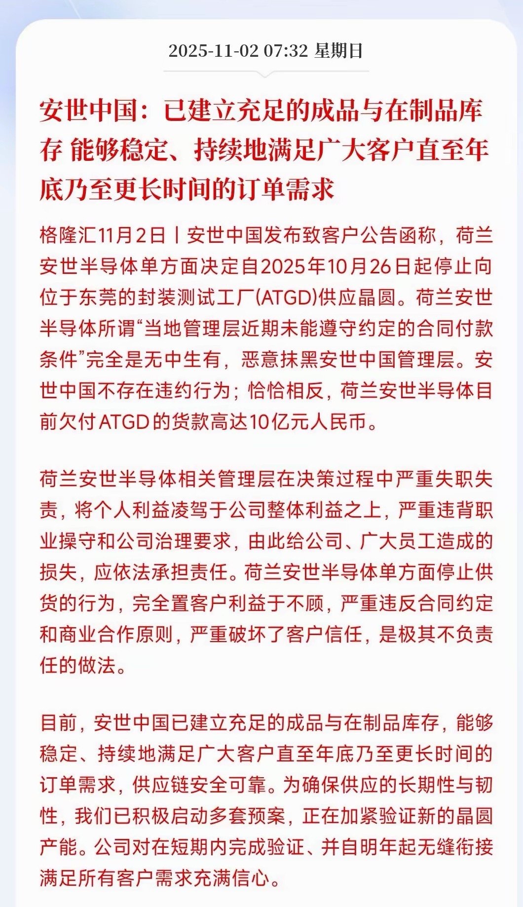 安世半导体最新公告明确:中国区半导体储备充足,国内客户供应完全无虞。反观欧洲,已因缺芯乱成一团——不少汽车厂商被迫削减产能,陷入生产停滞。