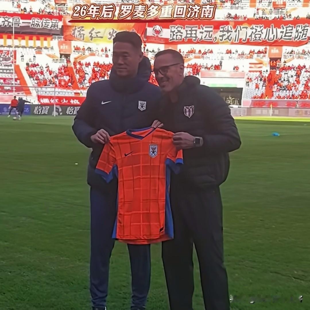 中超联赛又将迎来最后的间歇期,山东泰山,本赛季中超的主场赛事圆满收官。泰山队2:1战胜天津津门虎。 自8月初,泰山客场败走成都蓉城后,最近十场比赛,取得了6胜4平的骄人不败战绩。其中六球大胜北京国安、逆转取胜上海海港堪称经典。 此役,卡扎伊什维利再次攻入一球,同时也把本赛季个人中超进球扩大到25粒。美中不足的是,再次射失了点球。紧随其后的国安法比奥本轮也有两球入账。联赛还有最后一轮,本赛季中超金靴的争夺,或许只能到最后一刻才能见分晓。 值得一提的是,昨天济南奥体中心球场迎来了一位久别的故人,鲁能泰山99双冠王功臣,足协杯赛上演帽子戏法的罗麦多亲临现场,与昔日的搭档山东足球名宿宿茂臻合影留念。时隔26年的同框瞬间,这一刻仿佛梦回九九。 中超