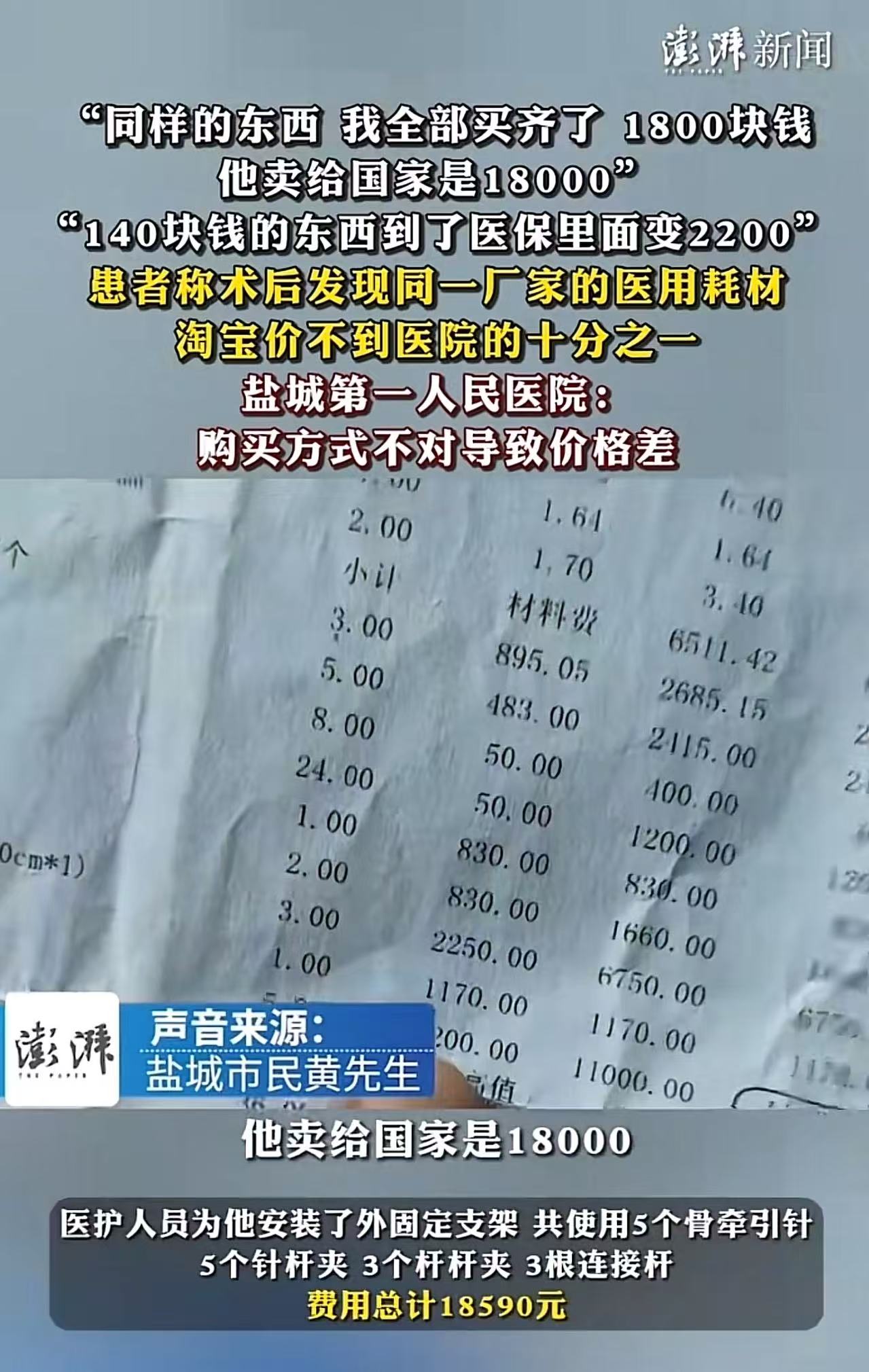“信息量太大了!”江苏盐城,男子手术出院后在网上查耗材的价格,结果发现同一个厂家的东西,自己在网上买只要1800,但是他卖给国家是18000元!网友:“合着医保报销后,自己花的钱还是那么多?”