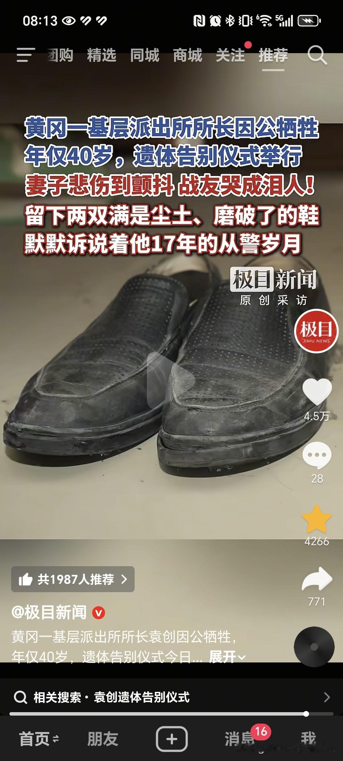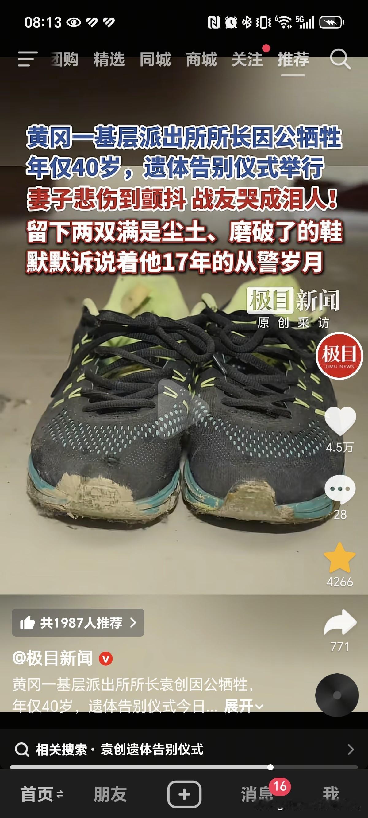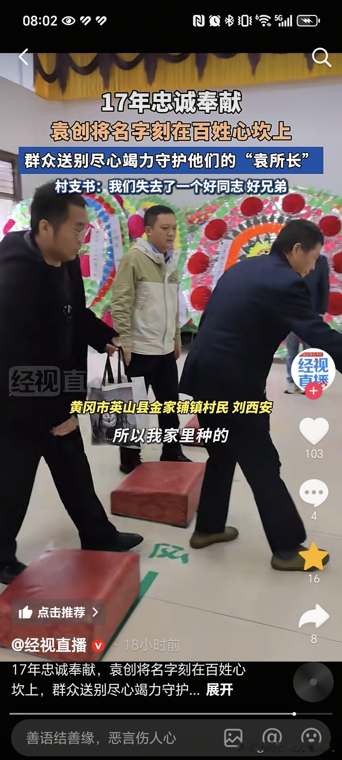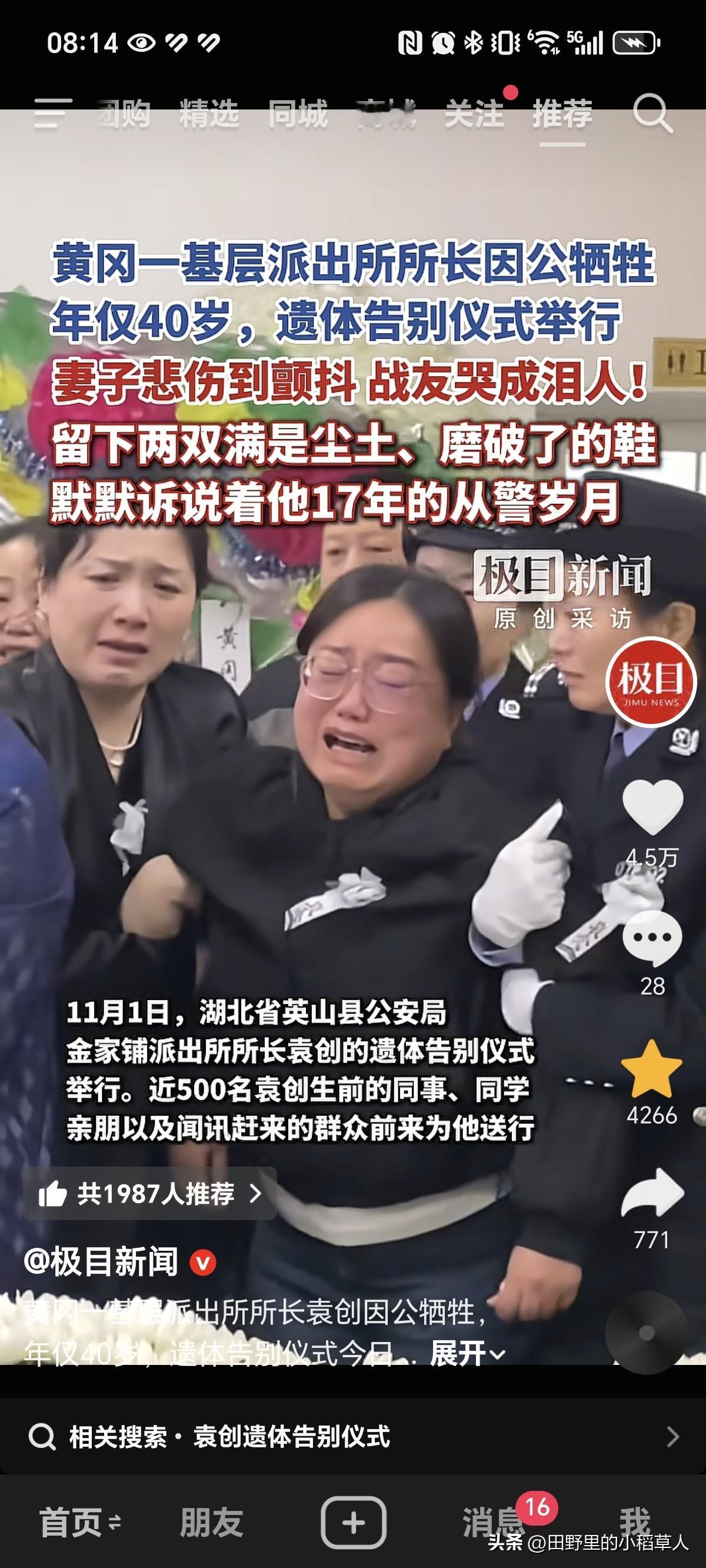 太年轻了!才40岁的派出所所长袁创,10月27号,在工作岗位,突发疾病去世,11月1号举行了告别仪式。妻子哭到浑身颤抖,需要人搀扶,另外上百名群众自发前来送最后一程。 那么,袁创到底是什么样的人呢? 第一,在送行队伍中,有一位手拿红色塑料袋的老者,颤颤巍巍的走向大厅,这并不是份子钱,而是家里的柿子,原来袁创在湖南黄冈英山县公安局金家铺任职,负责辖区27个村相关工作。 这位所长并不只是在办公室听手下汇报工作,反而喜欢下去走访调查,在这过程中,发现了有一个贫困家庭,女孩高考考了700分,可父亲60多岁,由于患上帕金森疾病,实在拿不出钱交学费,正当面临退学的选择时,所长带头组织捐款,并拿出自己一部分工资,起到了表率作用。钱筹够之后,并叮嘱说:上学的事情,有我在,就没问题,不用太发愁。 这次老者前来,虽然在这种场合,不应该拿红色的塑料袋装柿子,可能忽略了颜色 问题,能够理解。 图二图三,2双鞋子就是所长平时走基层时穿的,显然已经很破旧了,可还舍不得换,也说明对自己节俭。 第二,哥哥袁钊接受采访说:弟弟每年除夕夜都会在单位执勤。这也说明,对同事很好,没有领导架子,把全家团圆的机会留给别人。 没想到,这么一位好所长,才40岁就离开了,天妒英才呀,他有一句口头禅让小编深受感动:群众的事,耽误不得。 一路走好[流泪][流泪][流泪]。