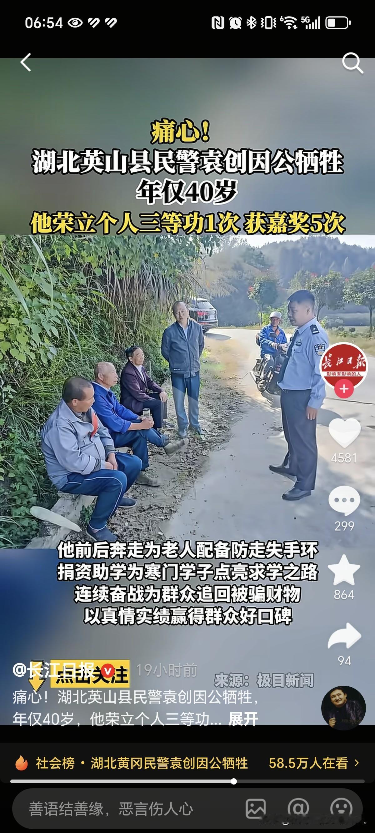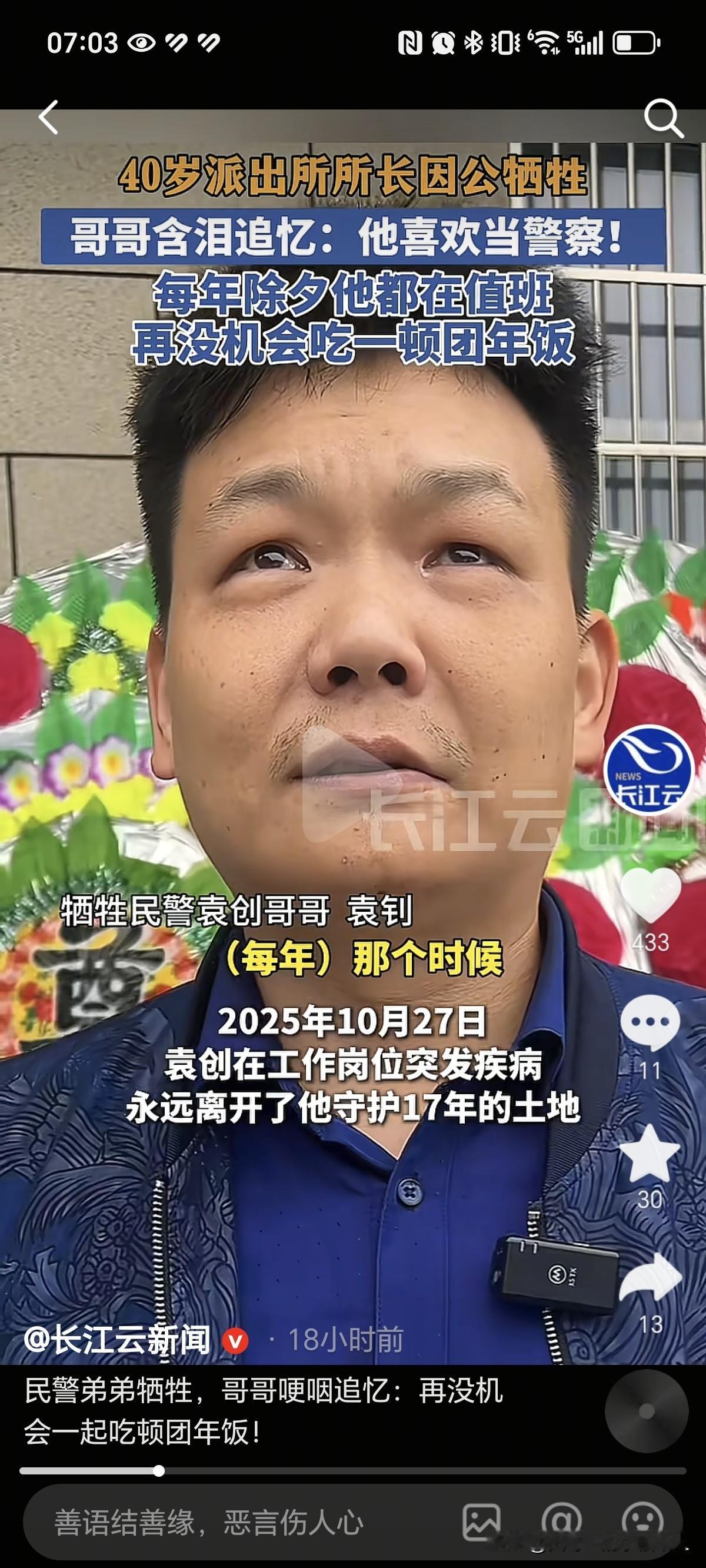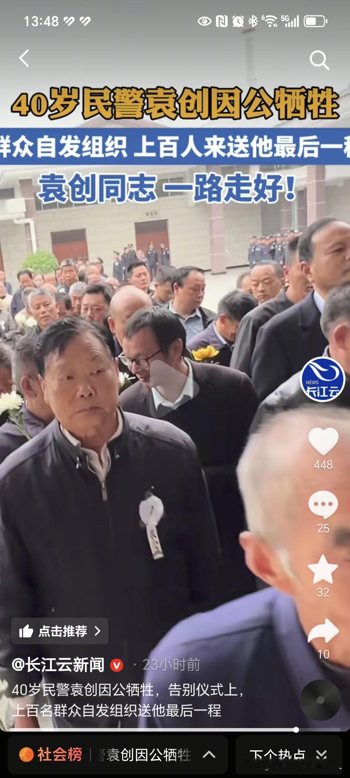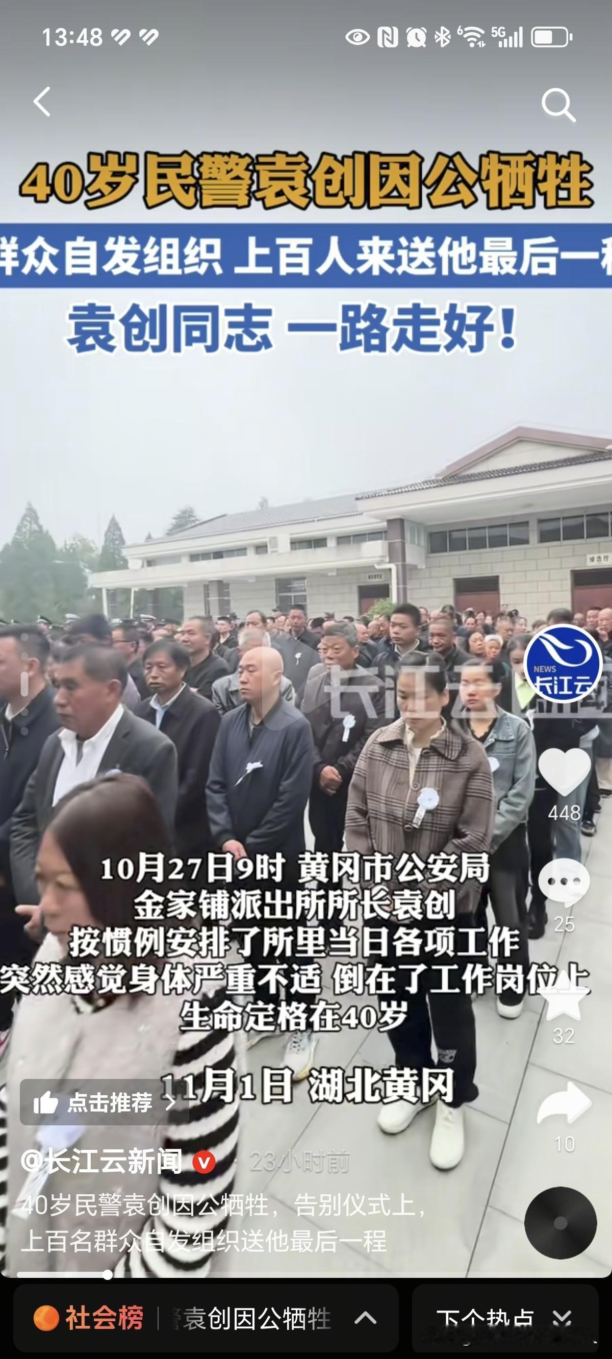 太年轻了!才40岁的派出所所长袁创,10月27号,在工作岗位,突发疾病去世,11月1号举行了告别仪式。妻子哭到浑身颤抖,需要人搀扶,另外上百名群众自发前来送最后一程。 那么,袁创到底是什么样的人呢? 第一,在送行队伍中,有一位手拿红色塑料袋的老者,颤颤巍巍的走向大厅,这并不是份子钱,而是家里的柿子,原来袁创在湖南黄冈英山县公安局金家铺任职,负责辖区27个村相关工作。 这位所长并不只是在办公室听手下汇报工作,反而喜欢下去走访调查,在这过程中,发现了有一个贫困家庭,女孩高考考了700分,可父亲60多岁,由于患上帕金森疾病,实在拿不出钱交学费,正当面临退学的选择时,所长带头组织捐款,并拿出自己一部分工资,起到了表率作用。钱筹够之后,并叮嘱说:上学的事情,有我在,就没问题,不用太发愁。 这次老者前来,虽然在这种场合,不应该拿红色的塑料袋装柿子,可能忽略了颜色 问题,能够理解。 图二图三,2双鞋子就是所长平时走基层时穿的,显然已经很破旧了,可还舍不得换,也说明对自己节俭。 第二,哥哥袁钊接受采访说:弟弟每年除夕夜都会在单位执勤。这也说明,对同事很好,没有领导架子,把全家团圆的机会留给别人。 没想到,这么一位好所长,才40岁就离开了,天妒英才呀,他有一句口头禅让小编深受感动:群众的事,耽误不得。 一路走好[流泪][流泪][流泪]。