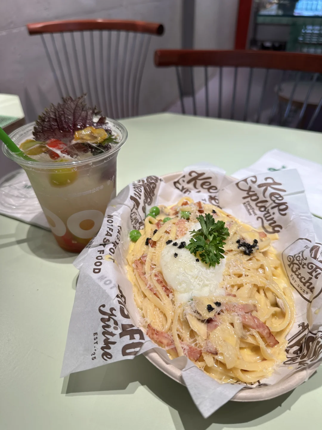 果断点了这个38元套餐——花胶鸡汤培根烩意面配温泉蛋+番茄气泡水。端上来的时候先被卖相惊艳:意面上铺着培根,中间卧着个圆滚滚的温泉蛋,汤汁裹得均匀。戳破温泉蛋的瞬间,蛋液流出来裹住意面,第一口直接香住!花胶鸡汤的鲜味很浓,培根的咸香混着面的筋道,完全不像平价套餐的水准,连吃几口都没觉得腻。