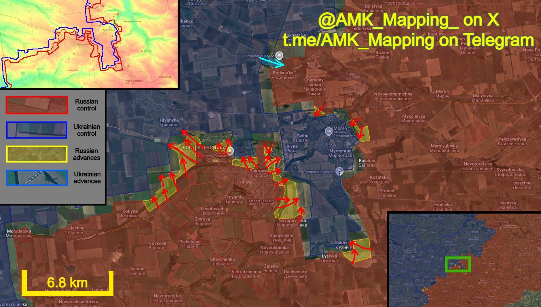 在波克罗夫斯克以东,俄军完成了对赫纳蒂夫卡和 Rih 村以及附近铁路线的占领,随后推进并攻占了更东边的树林地带。他们还夺取了新帕夫利夫卡的最后一部分区域。