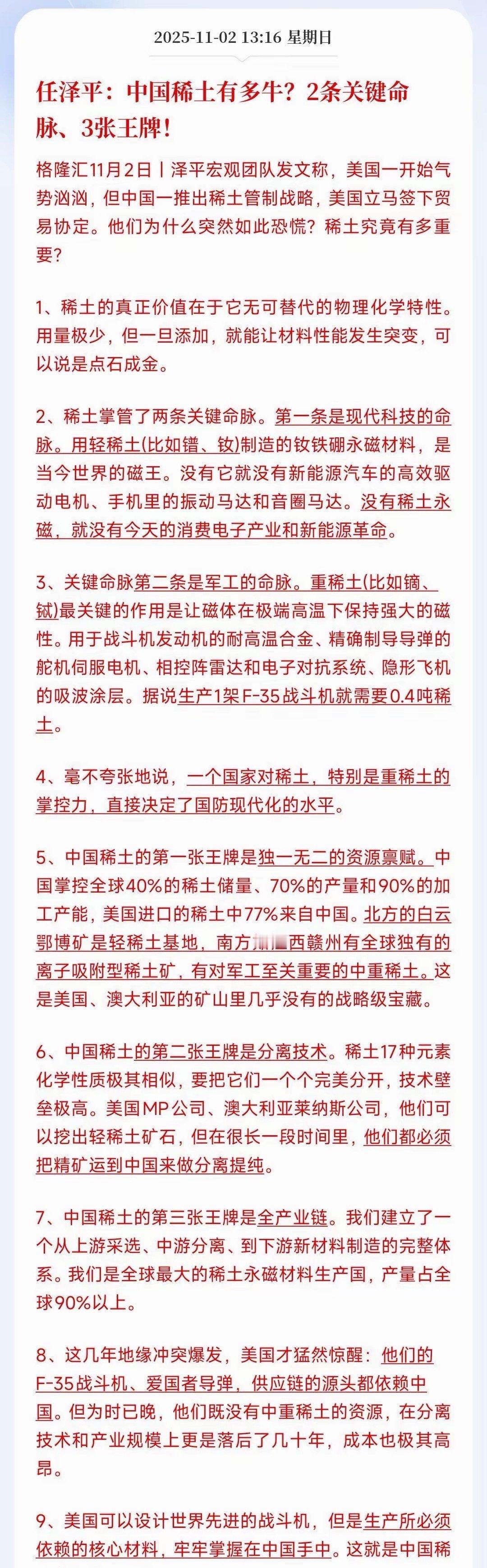 2.就是产业链,中国具有全产业链,可以全套精炼,大大降低了成本。其实美国也有技术分离稀土,但是没有配套产业链,如果现在建得5-10年才能建全,这还不算成本,要收回成本甚至得10-20年,这就让资本主义望而却步了。