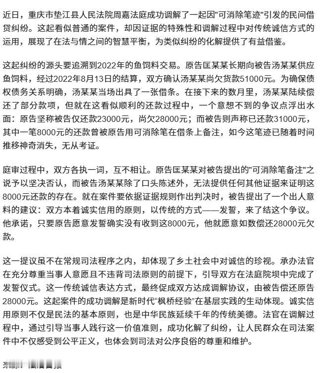 承办法官在充分尊重当事人意愿且不违背司法原则的前提下,引导双方在法庭院坝中完成了发誓仪式。这一传统诚信表达方式,最终促成双方达成调解协议,由被告偿还原告28000元。这起案件的成功调解是新时代“枫桥经验”在基层实践的生动体现。 网友们的留言:“发誓是有效力的,人而无信,不知其可。如果法律不认可发誓,就是道德的灾难!只要是正经说话,都是有效力的,发誓是更庄重的说话。”、“这不属于证据,这是双方当事人当着审判庭的面口头约定,该约定不违反法律规定,不违反公序良俗,那就是合法有效的。” “做生意的人,两万八千元不是事。通过对天发誓的形式,让对方背上一辈子的心理压力,也不算亏。而且发誓后,邻里乡亲都等于是监督者,今后此人一辈子都要被别人反复检视,相信这种糊涂账也难以再出现。两人是长期合作伙伴,和解了,今后生意还可以继续做,比关系破裂更可取。” “看到下面有人在调侃,我们重庆的人质朴,只要你对人家讲:谁扯谎谁全家死绝,看看有没人跟。只要对方说,你这人没意思,灰溜溜走开,先出手的人像常胜将军一样。” 看起来是可笑,但确实尊重两当事人的意愿,达成了和解。