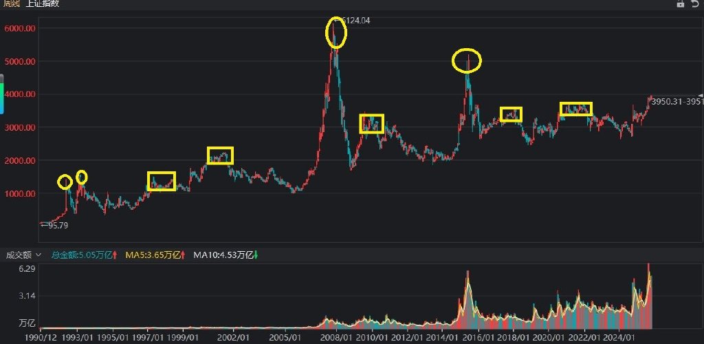中级别行情(指数涨30-70%)一般都是平顶或圆弧顶,顶部震荡时间一般接近而不超过单边上涨时间。如20年-21年的从2446涨到3600多,共11个月,然后在3400-3700之间震荡11个月就破位暴跌大2600多!