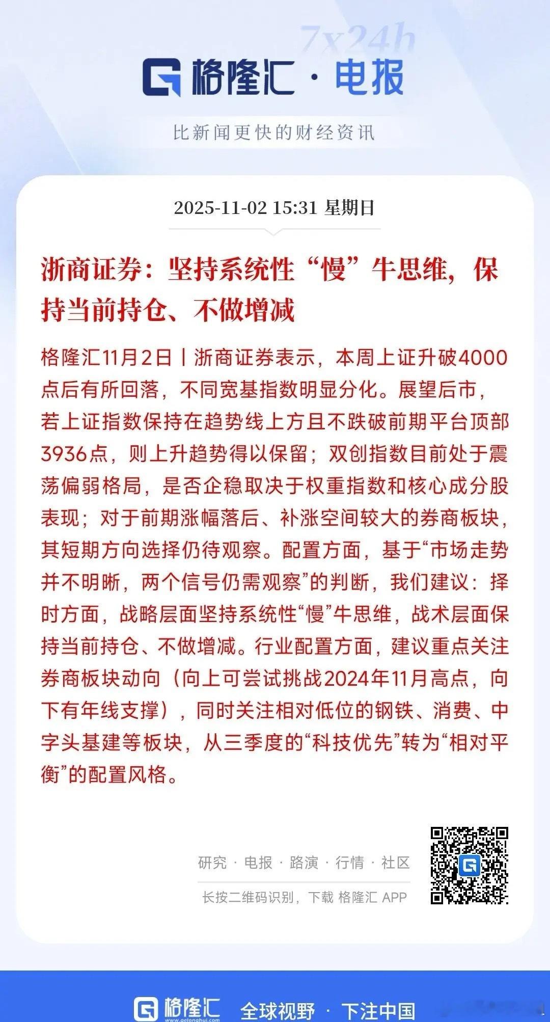 浙商证券认为:当下牛市当中不宜调仓换股,以投资者当前仓位为主。板块方面以券商,钢铁,消费等低位板块为主,不宜多配置科技股,要均衡配置。