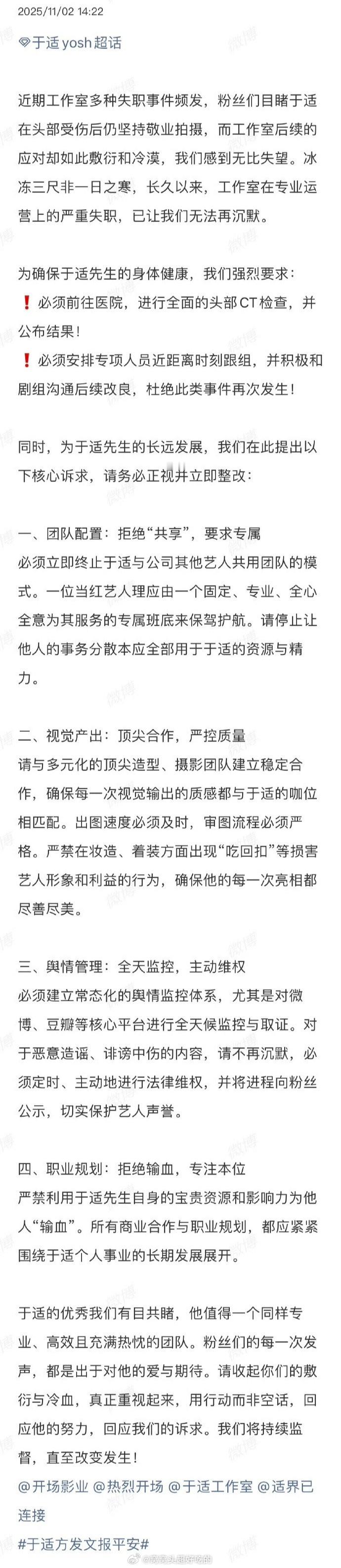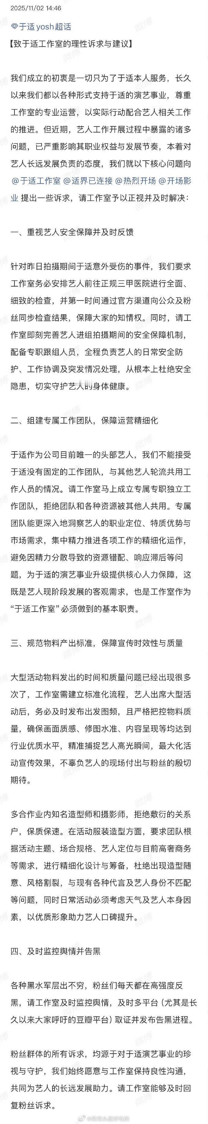 于适粉丝发文诉求于适粉丝正在维⭕️中要求于适工作室回应以下诉求[举手]