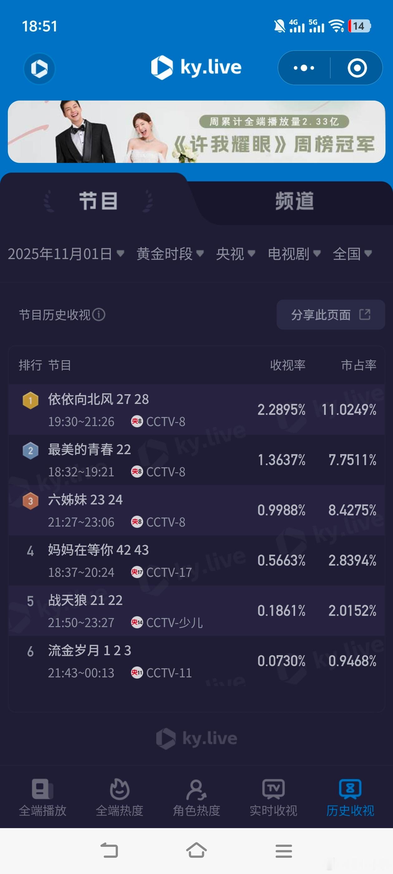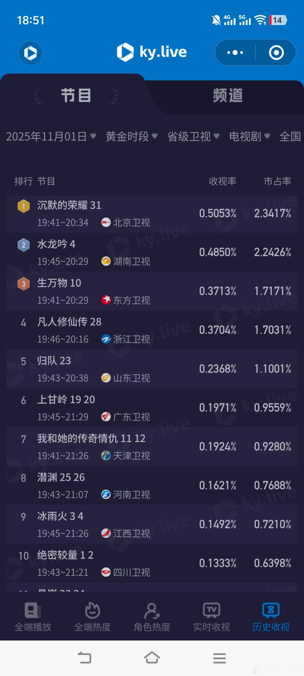 11月1日cvb收视日报,《生万物》《水龙吟》新高!