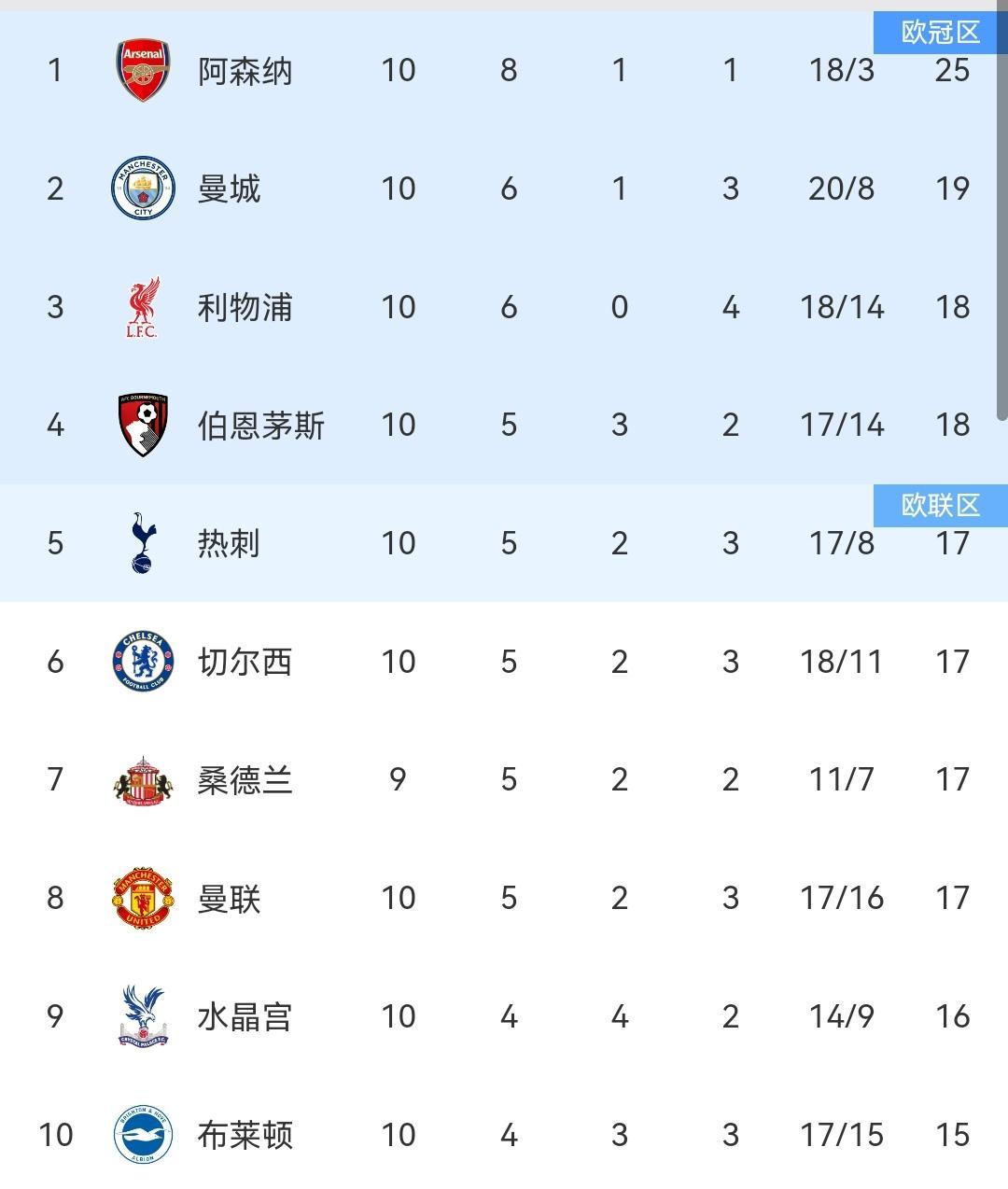 升至第二、大混战 英超第十轮,曼城坐镇伊蒂哈德球场迎战本赛季表现亮眼的伯恩矛斯,谢尔基两助攻、哈兰德双响、奥赖利建功,蓝月亮主场3-1战胜小樱桃,升至积分榜第二! 谢尔基自从六月份加盟蓝月亮以来,出战11场正式比赛,贡献3粒进球外加4次助攻,目前德转身价在4500万欧元,据统计,谢尔基是2025年欧洲五大联赛中唯一一位各项赛事在五场不同比赛送出多次助攻的球员! 曼城主场完成了对阵伯恩矛斯的九连胜,在这九连胜中,蓝月亮打进了34粒进球、仅丢4球,同时曼城还反超伯恩矛斯一分,来到积分榜第二! 英超最新积分榜,枪手6分优势领跑,曼城第二,红军、小樱桃同分排名三四,热刺、蓝军、红魔以及少赛一场的桑德兰均为17分排名五到八,水晶宫、海鸥、维拉排在九到十一,第二的曼城到第十一的维拉分差只有四分,堪称大混战!