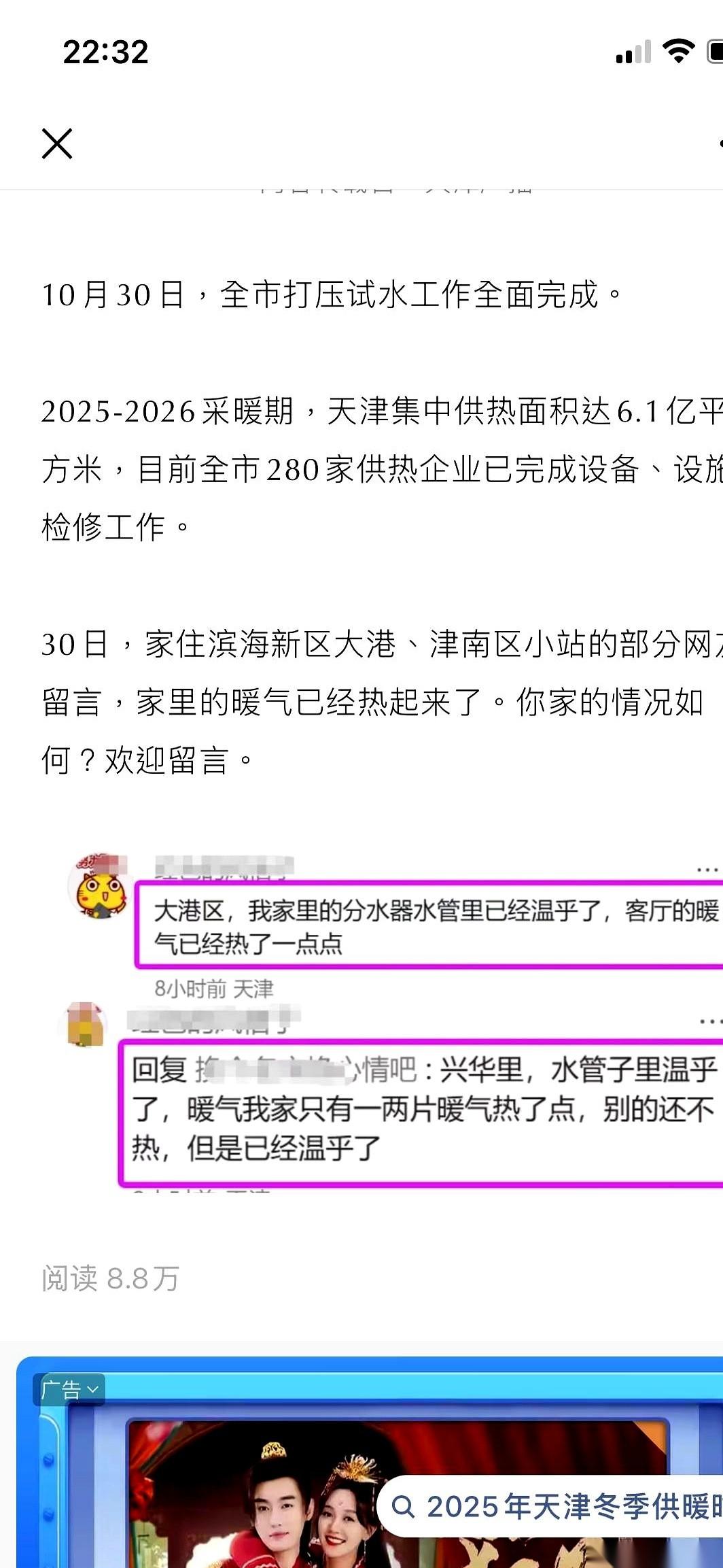 7号,1号,现在又说6号零点。 我抱着热水袋刷到这条新闻的时候,脚还是冰的。 每年一次,天津供暖日,都跟开盲盒似的,你永远不知道打开的是惊喜还是“惊吓”。 说是“因天气原因”…… 我寻思,这理由可真好使,万金油啊。天气不冷,我们盼着你供暖干嘛?吃饱了撑的? 夜里那温度,不开点儿设备真能给你冻醒。 别问我准备了没,我家小太阳、电热毯、厚睡衣,早就全套武装进入一级战备状态了。 真的,咱天津人,早就在这种“官方预告”和“体感现实”的拉扯中,活成了最懂随机应变的生存专家。 说白了,官方通知只是个“参考时间”,咱们自己腿上盖的毯子、怀里抱的热水袋,那才是真正的“供暖开始时间”。 别等了,该开空调开空调,该上电暖气上电暖气。 毕竟,咱自己的身体,可比那红头文件诚实多了。