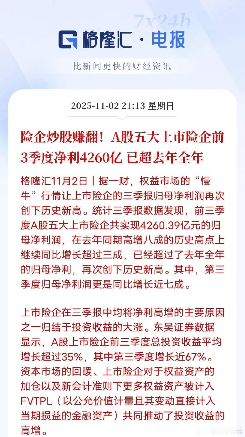 A股五大上市险企前三季度净利超4260亿,不仅刷新历史、超去年全年,单季增速更逼近七成。不少散户纳闷:盼着资金流向科技,咋先让不缺资本的险企“吃满”?这背后的逻辑其实很清晰。