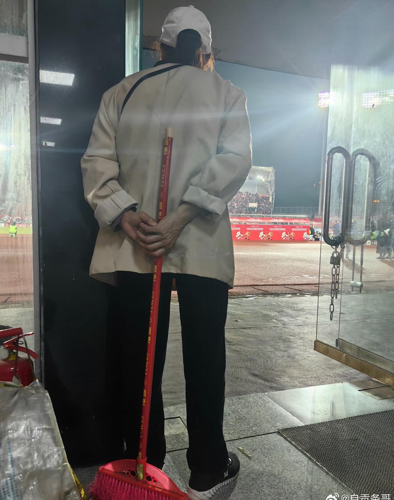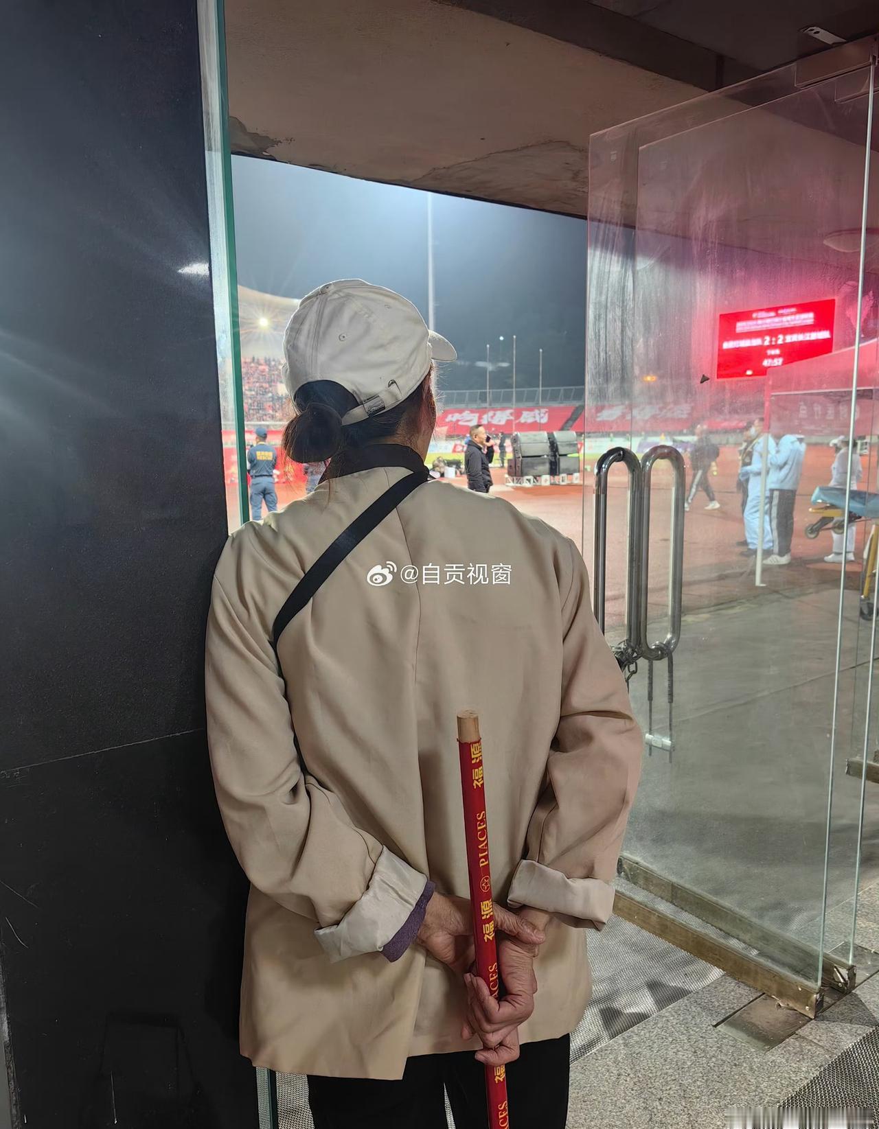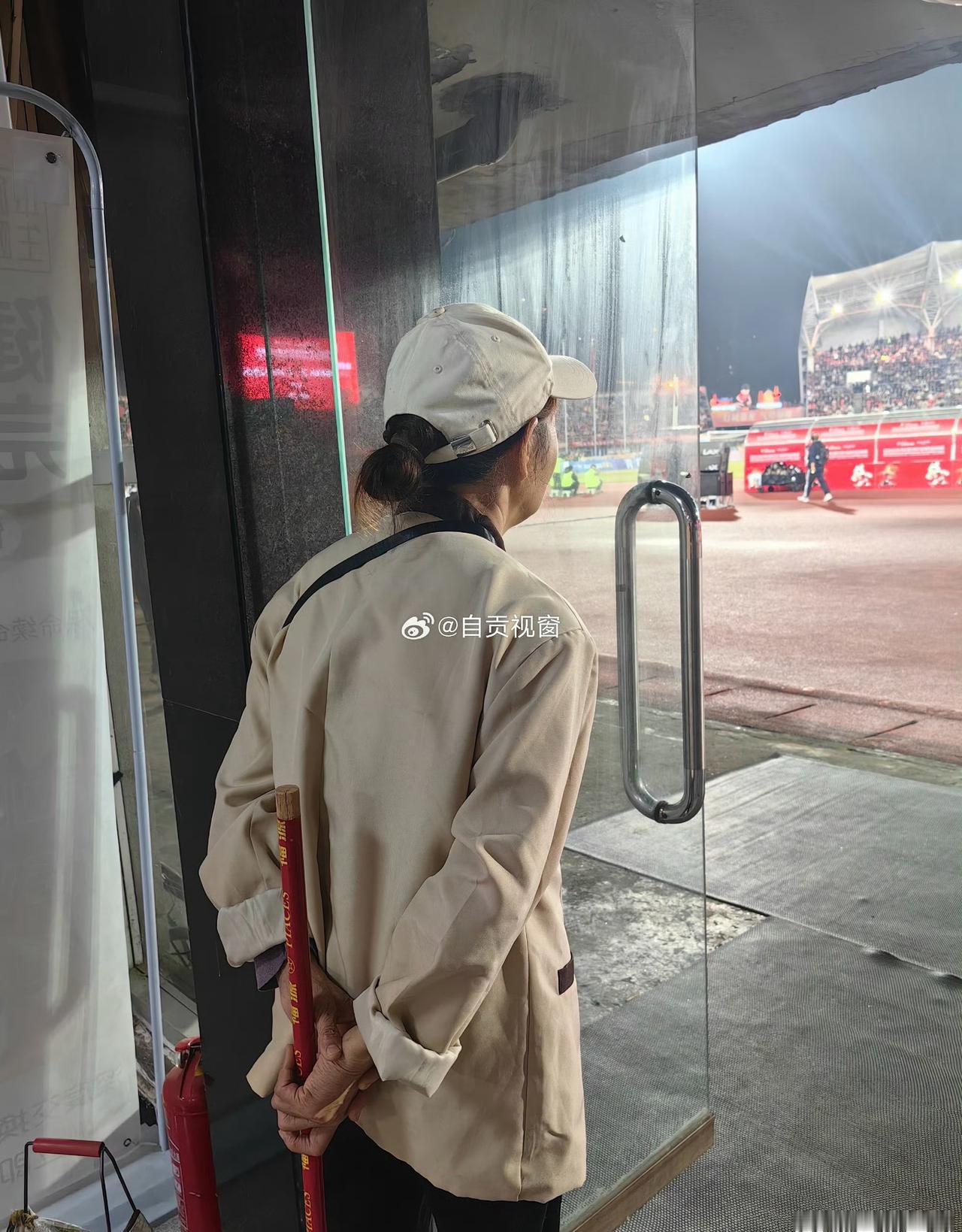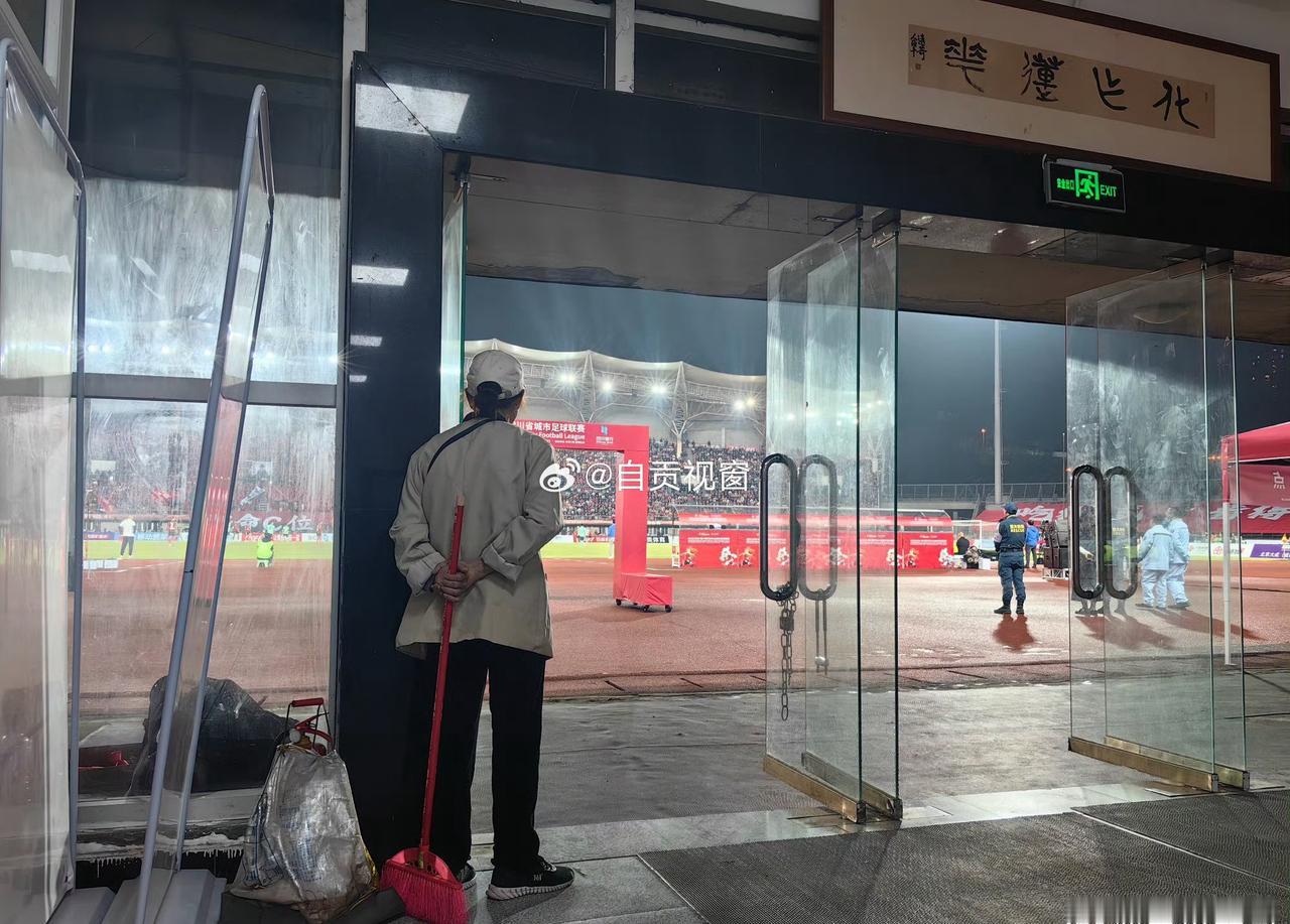 【自贡角落阿姨的川超身影 】在自贡南湖体育馆的角落里,一位清洁阿姨安静地站在自贡场馆门口,目光投向热闹的赛场,她的身影和扫帚,恰是川超力量的诠释。@自贡视窗