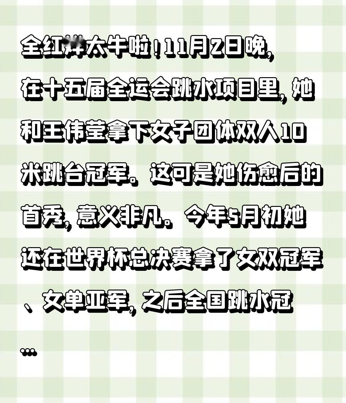 全红婵太牛啦!11月2日晚,在十五届全运会跳水项目里,她和王伟莹拿下女子团体双人10米跳台冠军。这可是她伤愈后的首秀,意义非凡。 今年5月初她还在世界杯总决赛拿了女双冠军、女单亚军,之后全国跳水冠军赛因旧伤复发退赛。这一休就是183天,一直在养伤和封闭训练。赛后全红婵发文“我真棒”,自信又可爱。虽然她不参加单人10米跳台,但出场时现场观众和粉丝尖叫不断。期待她之后带来更多惊喜!