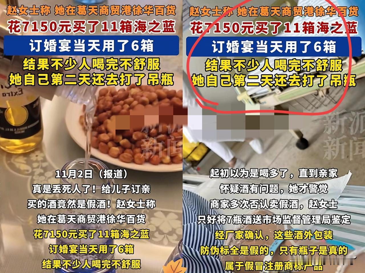 “真是丢死人了!”河南一女子因为儿子要订婚,本来是天大的喜事,于是花7000多买了11箱海之蓝,结果亲友喝完全喊不舒服 自己更是直接扎上了吊瓶!一辈子最要面子的时刻,愣是被假酒搅得颜面尽失。 更让人窝火的是,商家一句“我也是受害者”,就把法定“退一赔三”缩水成退酒钱加8000块赔偿! 假酒屡禁不止,核心就是违法成本太低!造假花几块,卖价翻几十倍,就算被罚点钱,换个马甲照样赚黑心钱! 消费者维权又费时间又费精力,很多人只能吃哑巴亏! 要我说,光罚销售端没用,必须顺着线索挖源头,从灌装到售卖全链条重罚,让造假者赔到倾家荡产才管用! 不然咱们普通人的面子和健康,永远是造假者的“提款机! 必须强化法律惩戒,让造假者付出沉重代价,才能守住公共安全的底线!