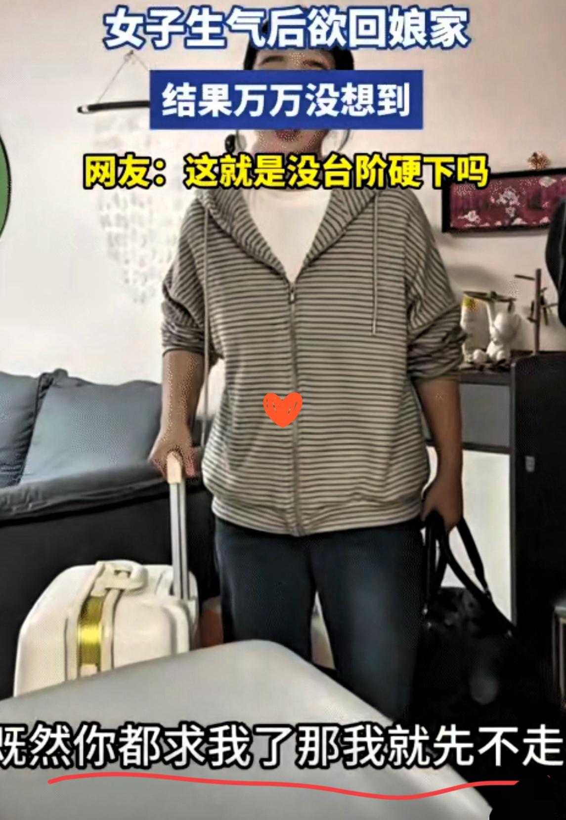 女子和老公吵架后,收拾好行李,要回娘家,老公没挽留。突然,她说: “你求我了,那我就先不走了。”网友: 这就是没台阶硬下吗?当时,她从房间拉着行李箱出来,行李箱上还放着一个包。结果她老公坐在客厅用平板看球赛,还吃着榛子。 这场景是不是特眼熟?说白了,吵架时的“要走”,多半是在喊“快来拦我”;那句“你求我了”,翻译过来其实是“给个理由让我留下来”。 男人总觉得女人麻烦,一会儿要走一会儿又留下,却没看懂行李箱滚轮碾过地板的声音,其实是在数“一、二、三”——等你说句软话。就像这女子,用“减两个菜”当台阶,既没丢面子,又给了彼此下台的路。 夫妻间哪有那么多深仇大恨?多数时候,吵的不是对错,是“你到底在不在意我”。那些“口是心非”的小把戏,比如摔门后留道缝,冷战时故意把对方的拖鞋摆整齐,都是在说“我还在乎”。 所以啊,别等对方把台阶铺到脚边还装傻。有时候一句“饭够不够吃”,比“我错了”还管用。你家那位有过什么让你哭笑不得的“求和信号”?来聊聊呗。