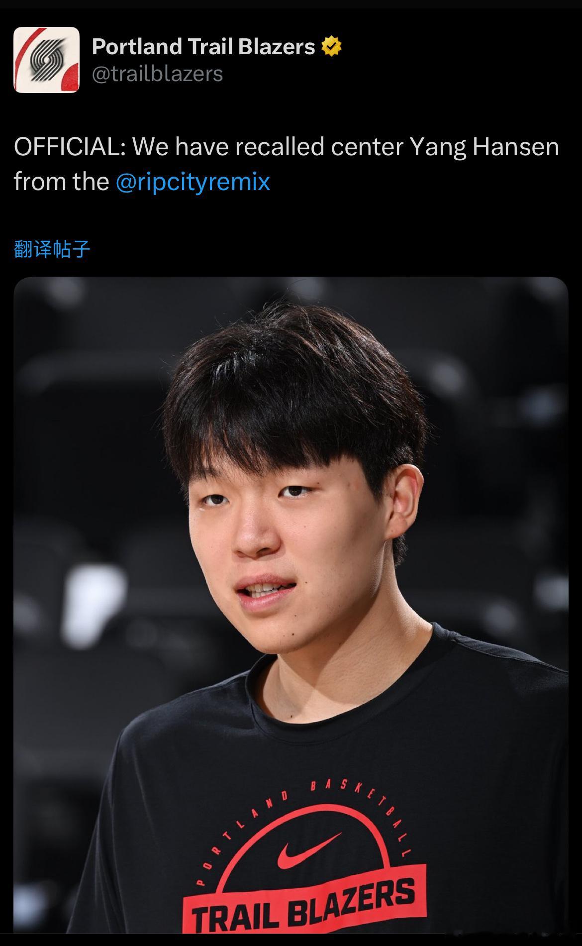 开拓者官方:球队已经从发展联盟召回杨瀚森