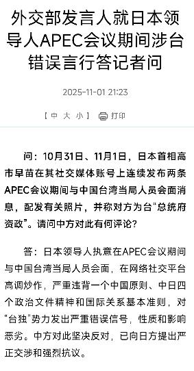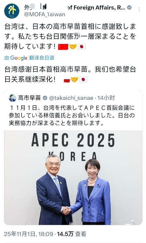 11月1日晚,台湾外事部门发文写道:“台湾感谢日本首相高市早苗。我们也希望台日关系继续深化!” 这哪是什么“务实合作”的客套话,明眼人一看就懂,是日本那边有人故意踩咱们的红线,给“台独”递刀子呢。事儿说起来不复杂,亚太经合组织峰会本来是聊区域经济合作的正经场合,日本首相高市早苗偏要在这儿搞小动作。 她不光专门见了代表台湾参会的林信义,还特意跑到社交平台发消息、配照片,一口一个对方是台湾“总统府资政”,大张旗鼓喊着要“深化日本和台湾的务实合作”。这根本不是无心之失,就是故意在国际上制造“两个中国”“一中一台”的假象,那小算盘打得,隔着屏幕都能听见响。 高市早苗这边刚出声,台湾外事部门就跟赶场子似的凑上去表忠心,那股子急着抱大腿的劲儿藏都藏不住。可他们忘了最关键的一点,台湾从来就不是一个“国家”,所谓的“台日关系”本身就是个假命题。世界上只有一个中国,台湾是中国地盘的一部分,这是国际社会都认的理儿,也是中日关系的根基,轮不到他们在这儿痴心妄想搞“合作”。 高市早苗作为日本首相,不可能不知道这事儿的分量。中日建交好多年了,“一个中国原则”早写进《中日联合声明》这些四个政治文件里了,这可是中日关系的“压舱石”。 1972年的《中日联合声明》写得明明白白,日本承认咱们中国政府是唯一合法政府,也尊重台湾是中国的一部分,还承诺遵守《波茨坦公告》,那公告里可是明确说要把日本当年抢的台湾还给中国。这些白纸黑字的承诺,到她这儿简直成了废纸。 尤其今年特殊,既是抗战胜利80周年,也是台湾光复80周年。当年日本殖民台湾,给台湾同胞造了多少孽,这笔账日本没资格忘。可高市早苗倒好,偏偏在台湾问题上跳得最欢,公然跟台湾当局的人勾连,这哪儿是背信弃义,简直是往咱们的历史伤口上撒盐。 中方反应特别快,外交部当晚就亮明态度,话说得特别硬:“这严重违背一个中国原则,给‘台独’递错误信号,性质太恶劣。” 不光口头反对,还直接找日方严正交涉、强烈抗议。驻日使馆也紧跟着发声,戳破他们的伪装,哪来的什么“总统府资政”,这就是粗暴干涉中国内政,挑衅咱们的主权。 明眼人都清楚,高市早苗这么干,无非是想借台湾问题给中国添堵,顺便在日本国内捞政治资本。可她打错了算盘,台湾问题是中国的核心利益,是碰不得的红线。别说见个面炒炒作,就算搞更大动作,也动摇不了咱们维护领土完整的决心。 之前就有日本人想模糊《中日联合声明》的法律效力,咱们当时就说了,这些文件是亚太秩序的基础,不是他们想不认就不认的。 再说了,中日能合作的地方多了去了,经贸、文化、环保,哪样不能好好谈?2024年中日贸易额就算有波动,也还在三千亿美元级别,日本企业在咱们这儿投了不少钱,中国市场也帮了日本经济不少。高市早苗非要在台湾问题上玩火,真把中日关系搞僵了,最后吃亏的还是日本自己,这种捡芝麻丢西瓜的蠢事,真不像个国家首相该做的。 至于台湾外事部门那通“感谢”,说白了就是自欺欺人。靠外人撑腰就能搞“台独”?纯属白日做梦。这些年“台独”越跳越欢,越说明他们心里没底。高市早苗的“示好”就是镜中花,既改变不了台湾的地位,也帮不了他们,反而会让他们更疯狂,最后加速自己的灭亡。 现在咱们已经把话挑明了,强烈敦促日方反思纠错,别再干涉中国内政,把“构建稳定中日关系”的话落到实处。 接下来就看日方怎么选了,是守承诺顾大局,还是跟着“台独”一条道走到黑。但有一点肯定,谁要是敢分裂中国、挑战一个中国原则,最后都得碰一鼻子灰,没好下场。台湾问题是中国自己的事,轮不到任何外人指手画脚,这一点永远不会变。