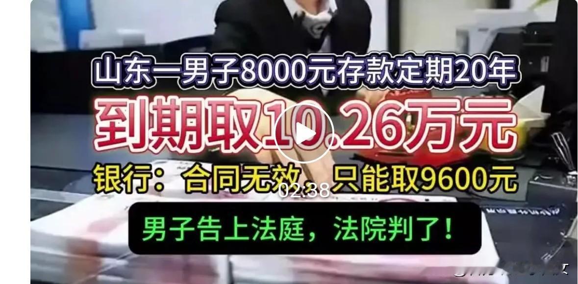 太崩溃了!山东,一男子8000元存款定期20年,到期取10.26万元,银行:合同无效,只能取9600元,男子告上法庭,法院判了!