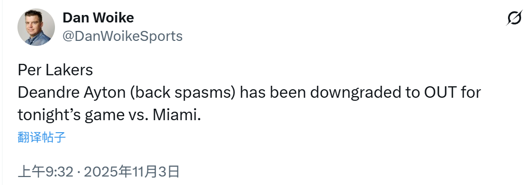 艾顿缺席今天比赛!