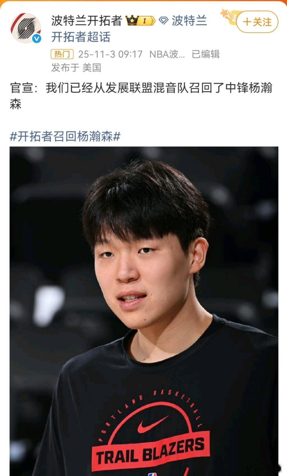 开拓者于2025年11月3日官方宣布从发展联盟附属球队"撕裂之城混音队"召回中国中锋杨瀚森。此次召回距离其下放(11月2日)仅间隔一天,本质是利用NBA比赛空档期为其提供额外训练资源,并非长期调整。