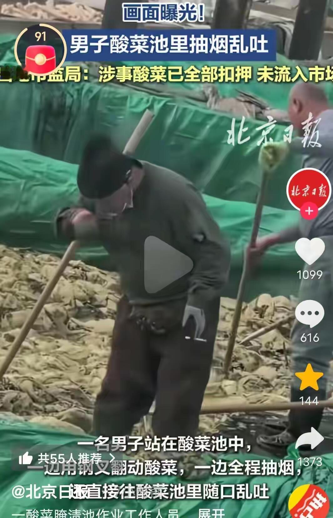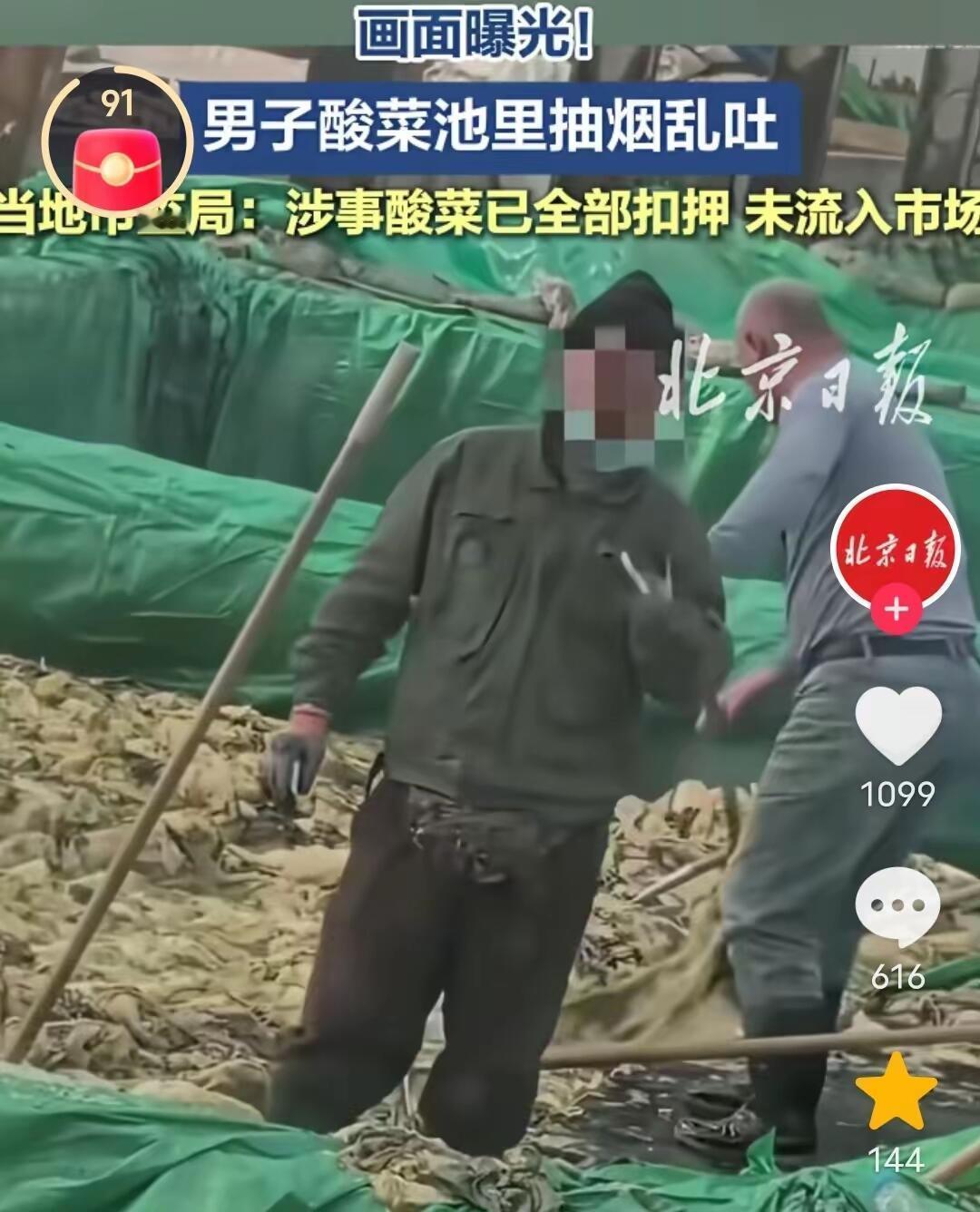 这事儿真是让人隔夜饭都要吐出来了。最近网上疯传辽宁一家酸菜厂的视频,里头一个工人直接站在酸菜池子里干活,一边拿钢叉翻酸菜,一边居然还在抽烟!更恶心的是,他扭头就朝池子里吐了口痰,简直把酸菜池当成了自家烟灰缸。 视频一出来网友全炸了,有人说“这简直是在挑战食品安全底线”,还有人直呼“以后再也不敢买酸菜了”。说真的,谁看了不反胃?从那视频能看出来,这厂子环境简陋,工人连个工作服都不穿,卫生条件差到这种地步,做出来的东西谁敢吃? 好在当地监管部门动作挺快,接到举报马上就去查了。最新通报说视频内容完全属实,那批被“加料”的酸菜已经全部扣下,准备销毁。最值得庆幸的是这批问题产品还没卖到市场上,不然不知道多少人要遭殃。 要我说,这种事儿暴露的问题真不少。首先这些食品厂工人的职业素质实在太差了,基本的安全卫生意识都没有。再者,对这种小作坊的监管看来还得加强,这次要不是被人拍下来曝光,指不定还要生产多少“口水酸菜”。 现在那个吐痰的工人肯定饭碗丢了,相关责任人也跑不了处罚,纯属活该。这次算是个教训,希望所有搞食品的人都能长点儿心——你手里经手的是别人要吃进嘴的东西,真不能这么胡来。咱们消费者的健康,可经不起这么折腾。