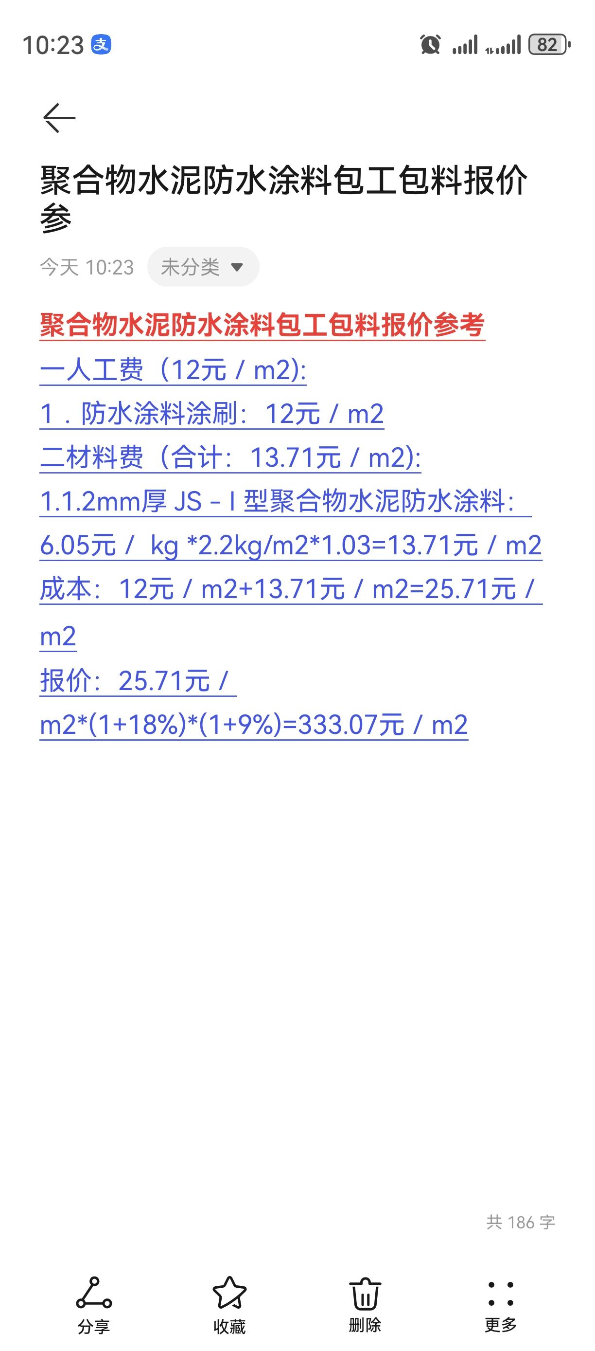 家人们,今天来给大家分享一下聚合物水泥防水涂料包工包料的报价参考,准备装修或者做工程的朋友可一定要听好了! 咱先说说成本构成哈。人工费呢,防水涂料涂刷每平方米是12元。材料费,主要是1.2mm厚的JS-I型聚合物水泥防水涂料,算下来每平方米是13.71元,就是用6.05元/kg乘以2.2kg/m²再乘以1.03得到的。这样成本加起来就是每平方米25.71元。 再来说说报价,考虑到管理费、利润和税金这些,最终报价是25.71元/m²×(1+18%)×(1+9%),算出来是33.07元/m²。这里我可得给大家提个醒,市场上有些报价可能会低得离谱,这时候你就得小心了,很可能材料质量不行,或者施工工艺有问题。当然啦,也别觉得价格高就一定好,有些不良商家会故意抬高价格坑人。大家在选择的时候,一定要多对比几家,看看他们的材料品牌、施工工艺,还有售后服务,千万别只看价格,不然最后可能防水没做好,麻烦可就大了!希望大家都能避坑,选到性价比高的聚合物水泥防水涂料包工包料服务哦!