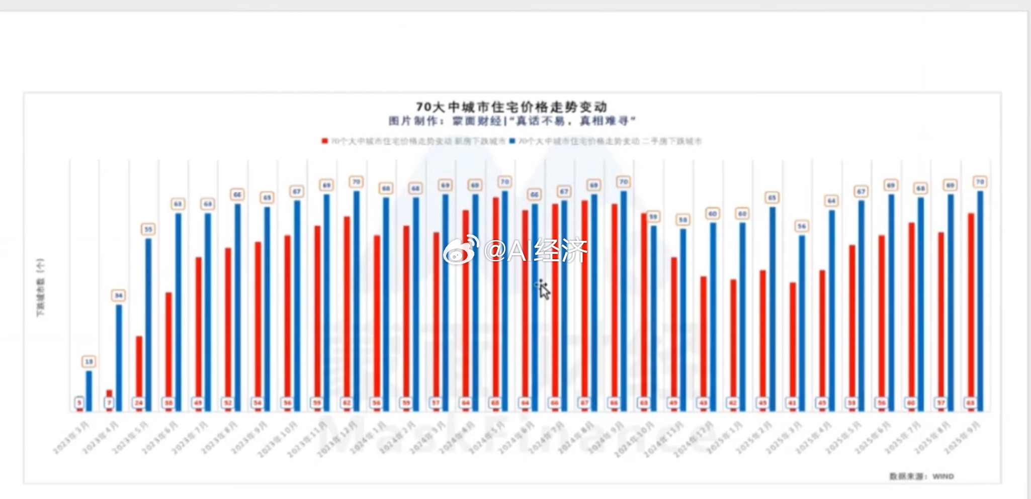 1. 普跌格局形成: 图2显示,到2025年10月,70个大中城市中,二手房价格下跌的城市数量高达 69个,仅1个城市上涨(或持平)。新房价格下跌的城市数量也远超上涨城市(59 vs 11)。这表明房价下跌已是全国范围内的普遍现象,而非个别城市的问题。