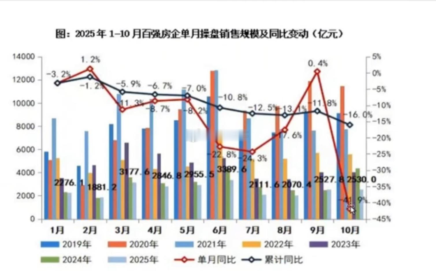 1. 销售额断崖式下跌: 图1显示,2025年10月,百强房企单月销售额仅为2530.0亿元,同比(红线)暴跌 -41.9%。这是一个极其悲观的信号,表明传统的“金九银十”销售旺季在2025年完全失效。