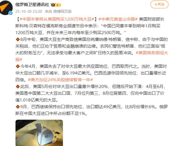 那18万吨大豆一出手,我就知道,好戏要开场了。 谁都没想到,平时不起眼的大豆能在中美之间掀起这么大的波澜。2025年10月30号,美国财长斯科特·贝森特一句话,直接让全球卖粮食的都炸了,说中国这季度(到2026年1月为止)要买1200万吨美国大豆,还答应未来三年,每年都要收2500万吨。 这量有多吓人?给你算笔账,2024年一整年美国大豆卖给别的国家总共才赚了245亿美元,这里面差不多128亿都是中国贡献的,说白了,美国每卖两吨大豆,就有一吨是运到中国的。 消息刚出来,特朗普比谁都积极,立马在社交账号上跳出来抢功劳,字里行间都在说“这都是我的本事”,还顺手把芬太尼关税的事扯了进来。这操作看着乱,其实特好懂。美国那些种庄稼的州,向来都是特朗普的票仓,而大豆就是这些州农民的“钱袋子”。 美国农业部早有数据,2023年的时候,平均每个美国农民靠卖给中国农产品,一年就能多挣近9000美元。中国可是实打实的美国农产品最大买家,差不多占了美国农产品总出口的五分之一。现在中国抛这么大的订单,那些农业州的选票,自然就更稳了。 但这订单真不是咱们单方面“赏饭吃”,是实实在在的互相占便宜。咱们国内对大豆的需求有多夸张?你平时超市买的豆油、家里吃的肉蛋奶,全都跟这小小的黄豆有关系。大豆榨完油剩下的豆粕,是喂猪喂鸡的好饲料,这东西价格稳不稳,直接关系到咱们买猪肉、买鸡蛋贵不贵。 咱们是全球最大的农产品进口国,找美国买大豆,说白了就是用咱们的大市场,换稳定的货源。毕竟美国那些大豆主产区,种地都是规模化的,成本低,能帮咱们把物价稳住,保障大家的日常需求。 有人说这是中美做生意的“缓兵之计”,但往深了想,农业早就是两国合作最靠谱的那块基石。从之前的艾奥瓦州“大豆之旅”,到一起研究怎么在气候变化下种好庄稼,这么多年来,中美在农业上一直是各取所需的典范。 咱们需要好的农产品,满足大家吃得更好的需求;美国农民需要大市场,能多赚钱。这笔买卖,谁都不亏。就像这次的订单,既让美国农场主的粮仓能及时清空拿到钱,也让咱们的食品加工厂有稳定的原材料,典型的双赢。 不过特朗普想把大豆订单和芬太尼关税搅和在一起,搞“买大豆就得让步”那套,其实是打错了算盘。大豆生意的核心是市场规律,不是政治筹码。中国买美国大豆,是因为咱们真的需要,也是认可中美农业合作,但这绝不代表咱们会在原则问题上松口。做生意讲究你情我愿,想拿农产品订单逼咱们让步,门儿都没有。 现在全世界的粮食市场都不太平,要么是极端天气毁了庄稼,要么是地区冲突断了运输。中美在大豆这种刚需农产品上保持稳定合作,不光对两国好,更是给全球粮食安全添了份保障。这1200万吨大豆的订单,与其说是“好戏开场”,不如说是合作的“续篇”,它说明做生意这事儿,没有绝对的输赢,只有互相帮忙才能走得远。 毕竟,不管是咱们的菜篮子能不能装满、买得值不值,还是美国农民的粮仓能不能变现、日子过得好不好,都得靠这种实打实的合作撑着。