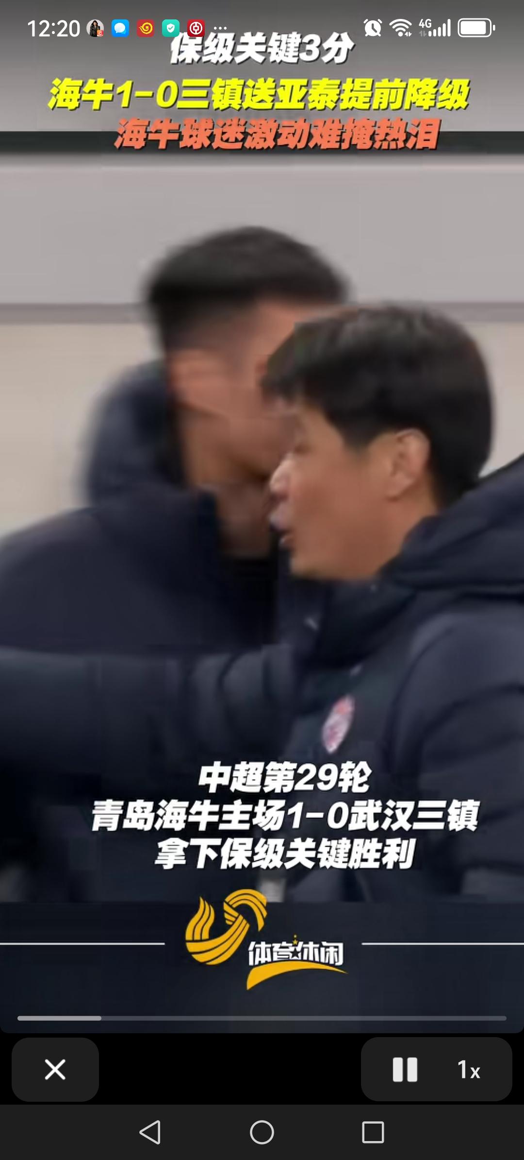 青岛海牛主场1:0战胜武汉三镇,取得了保级的最最关键的一战,主教练李霄鹏乐了,青岛海牛的球迷哭了,海牛终于可以继续留在中超了。 此役过后青岛海牛已领先梅州客家三分。比赛还有最后一轮,青岛海牛客场只要不输给浙江,就能稳稳保级成功。倒数第二的梅州客家客场挑战北京国安,赢球概率微乎其微。也就是说青岛海牛保级已经成功。