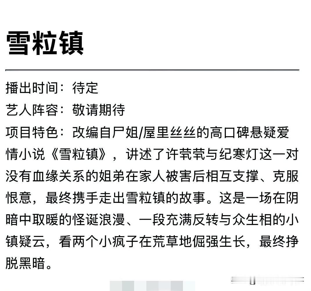 我的今日状态:😁轻松愉快 我这里的天气:☀️晴天 《雪粒镇》官宣引期待:王楚然徐振轩组颜值CP,姐弟伪骨科+悬疑太带感 《雪粒镇》官宣阵容,王楚然与徐振轩领衔主演引发热议。原著小说口碑不俗,此次影视化聚焦“姐弟伪骨科”设定,搭配烧脑悬疑剧情,自带话题度。 王楚然饰演的坚韧姐姐与徐振轩塑造的阴湿弟弟,人设反差感拉满,二人同框堪称颜值盛宴,CP感溢出屏幕;徐振轩此次担纲男主,事业再上台阶,而这对新鲜组合与带感剧情的碰撞,让剧集未播先火,期待值拉满。