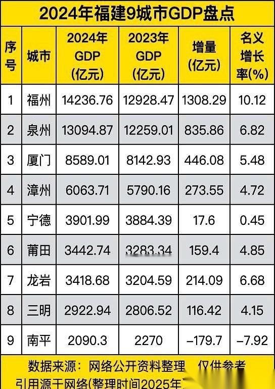我天,福建这张成绩单,看得我心脏一紧。 福州这是彻底杀疯了啊。一年,就一年,直接多干出来了1300多个亿。 你知道这是什么概念吗?等于硬生生又造出了一个中等城市。太猛了。 泉州在后面看得估计眼睛都红了,就差那么一口气。俩巨头贴身肉搏,这画面,啧啧。 其他人呢,厦门、漳州什么的,都还算稳,小步快跑,跟着大哥们喝点汤。 但最让人揪心的,是南平。 真的,太扎心了。 大家都在往前冲,哪怕是爬,也是往上爬。 他倒好,直接挂倒挡,一脚油门踩下去,-7.92%。 这哪是冷冰冰的数字啊。 这背后是多少家小店关门,多少人背着包离开家乡去福州厦门找机会。 说白了,城市之间的竞争,比我们职场里卷多了。 一步跟不上,就可能掉队好几年。 资源、人才、政策,全都在往高处流。 这不就是现实版的“大鱼吃小鱼”么。 希望南平能喘口气,赶紧找到自己的路。 不然,时代抛弃你的时候,连个招呼都不会打。