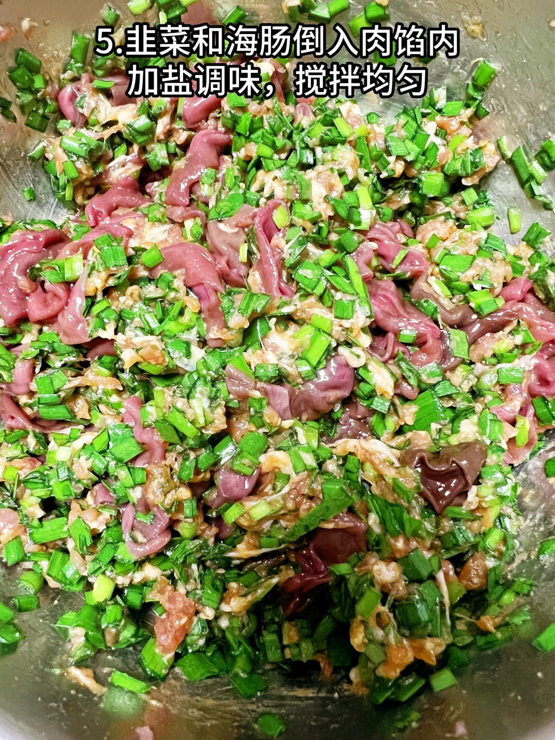 5、韭菜和海肠倒入肉馅内,加盐调味,搅拌均匀