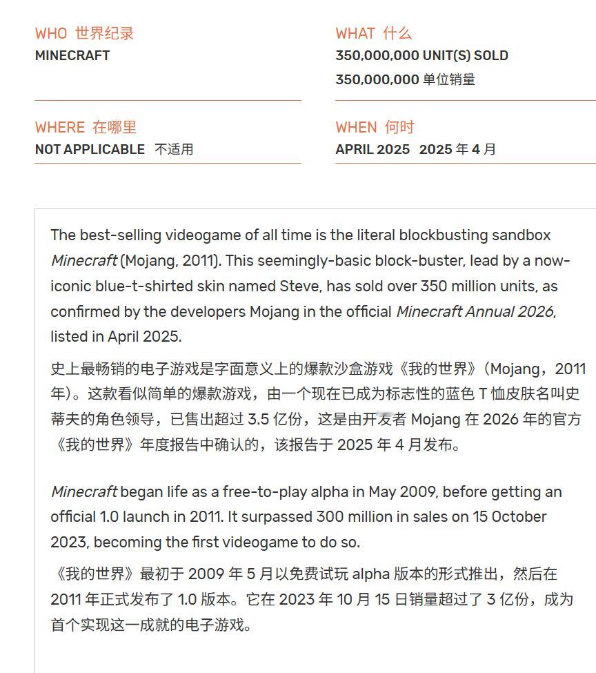 《我的世界》官方销量已突破3.5 亿份,为销量最高的电子游戏,数据由Mojang Studios在“《我的世界》 年度报告 2026”中确认。并由吉尼斯世界纪录官网收录为“销量最高的电子游戏”。