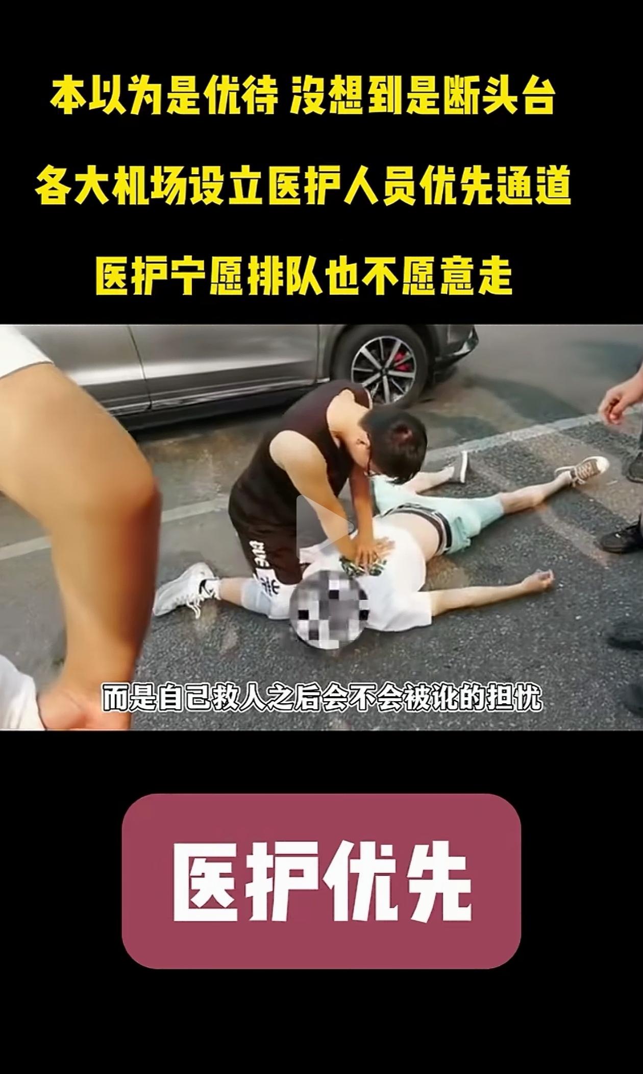 机场医护人员优先通道? 这样的通道,你愿意走吗? 更有意思的是 没有证件的人,可以凭借善良和热血,毫不犹豫挺身而出,放开手脚奋力施救。 而手持医师证的人,即便心知有《医师法》和《民法典》的保护,却依然顾虑重重束手束脚。 职业荣誉和道德不允许我们袖手旁观,但现实的风险却让白大褂从战袍变成了枷锁。 所以,回到最初的问题,我的回答是: 人,我或许会救。但优先通道,我绝不会走。