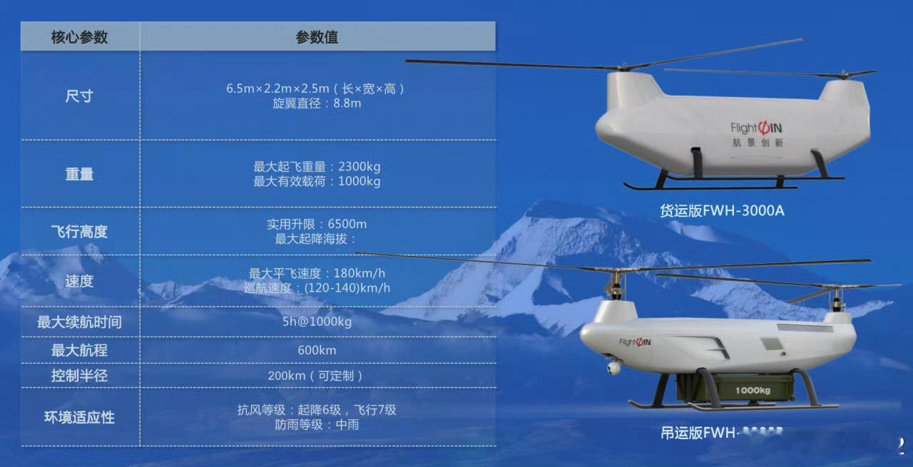 他比航景公司的FWH3000图6~图9小,但性能毫不逊色。FWH3000最大起飞重量2500kg最大任务载重1000kg,最大速度180km/h巡航120~140左右。升限6500m,抗风能力6级(起降)/7级(飞行),最大续航时间5h。
