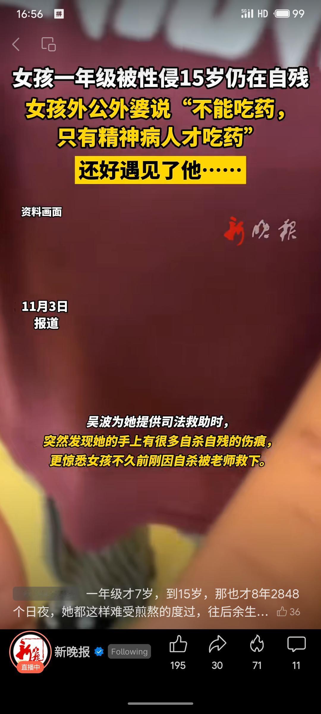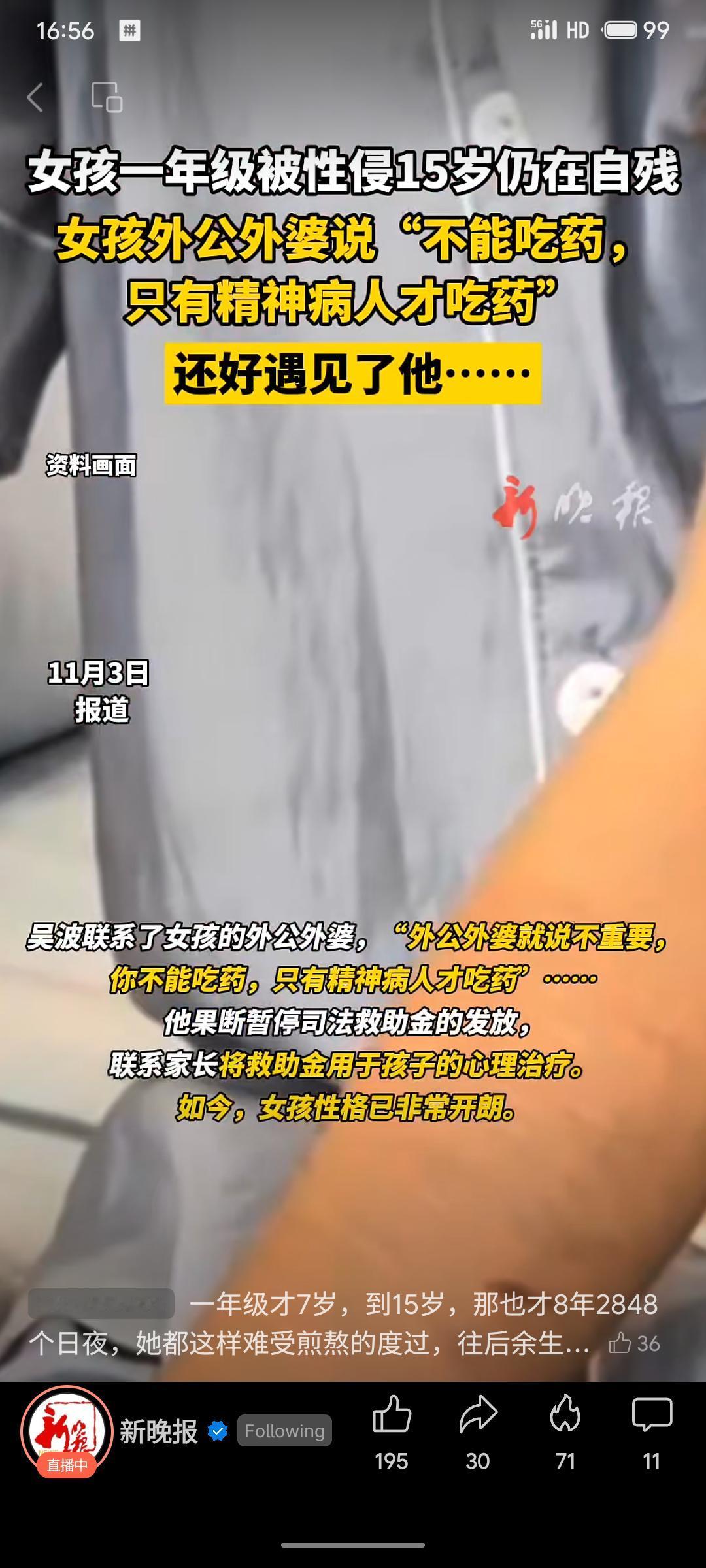 一名女孩在小学一年级时遭性侵,直至15岁仍长期受心理创伤困扰而自残。其外公外婆却错误认为"只有精神病人才吃药",阻碍其接受治疗。承办检察官吴波发现后,果断调整司法救助金用途,坚持将其用于心理干预。经专业治疗,女孩状态明显好转,性格逐渐开朗。