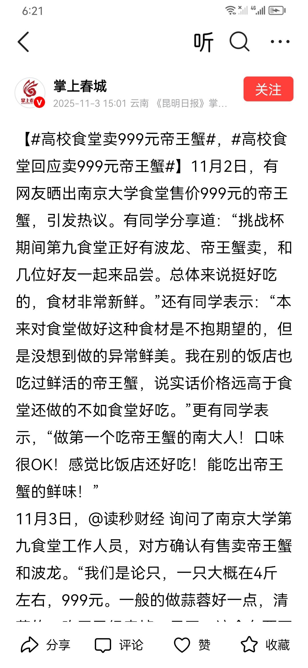 南大帝王蟹999元,这个,让穷学生情何以堪呀!