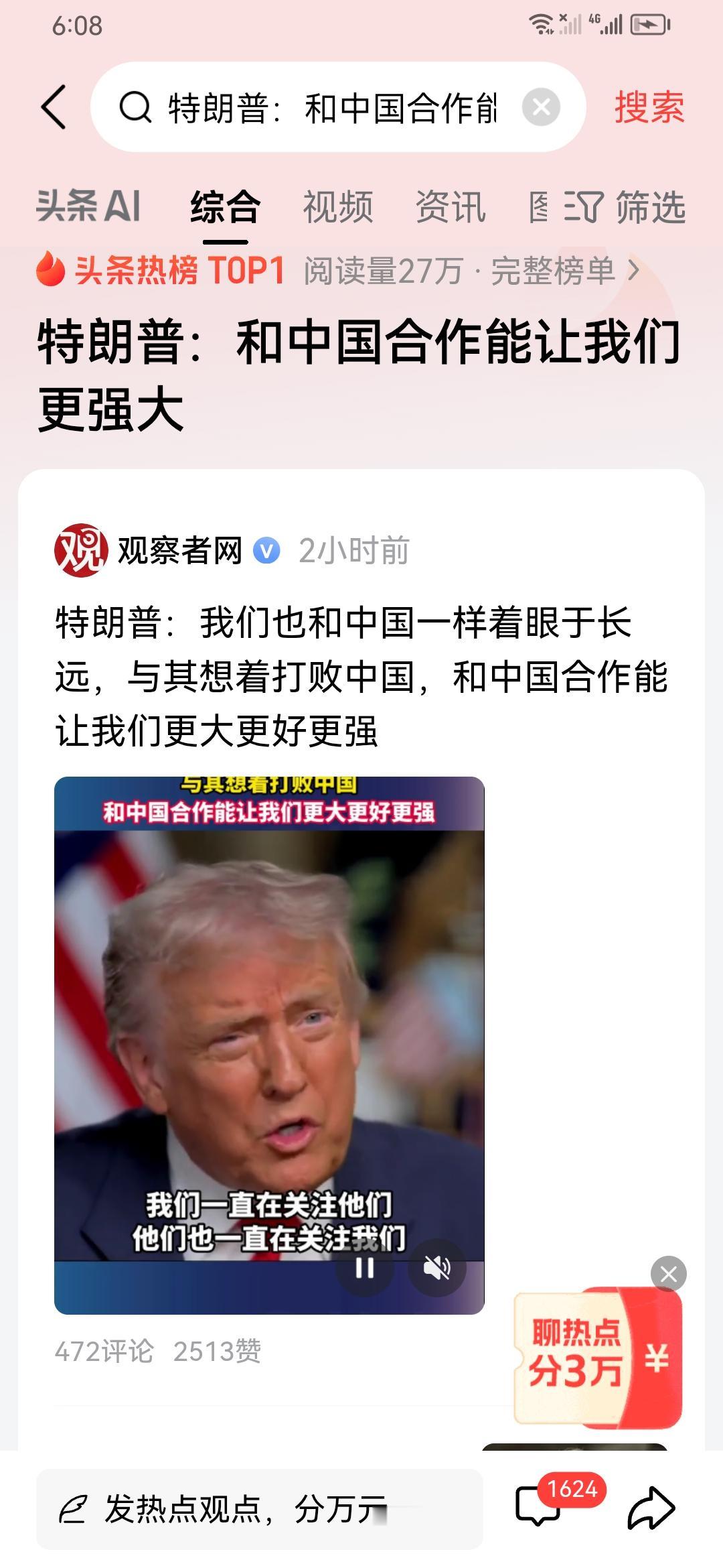 川普态度变了,表示合作能让彼此强大更好。中方人力,美方科技,中方科技已在赶超,美方态度变化,不得不软化立场。世界向好。