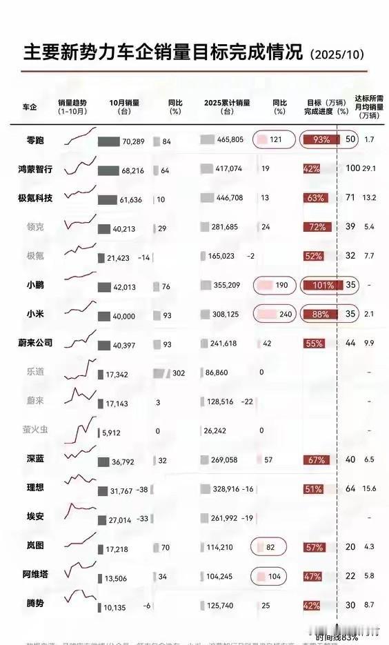 小鹏汽车厉害了!10个月完成全年销量目标! 2025年的10个月过完了,时间过了全年的83%,各家新势力车企销量情况完成的怎么样呢?不好意思已经有车企完成全年目标了! 年销量35万目标的小鹏,前10个月卖了35.5万台,提前两个月完成年度目标 你就说牛不牛?还剩两个月,按小鹏目前的情况看,全年超过40万那是轻轻松松! 零跑距离完成全年50万台的目标也是触手可及,只差不到4万台了,按现在月销6万的情况来看,下个月100%能完成全年目标。 另一个能完成目标的大概率就是小米了,前10月卖了接近31万台 ,距离35万的目标也不遥远了,以小米不愁订单的现状,完成目标完全没有悬念。 其它车企要搞定全年目标,感觉都有难度啊,加油吧 ,时间不多了!