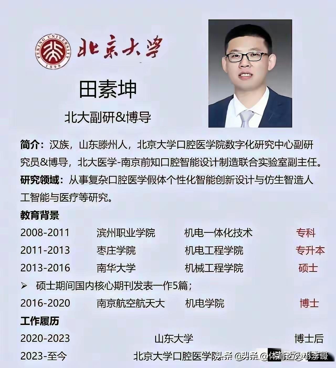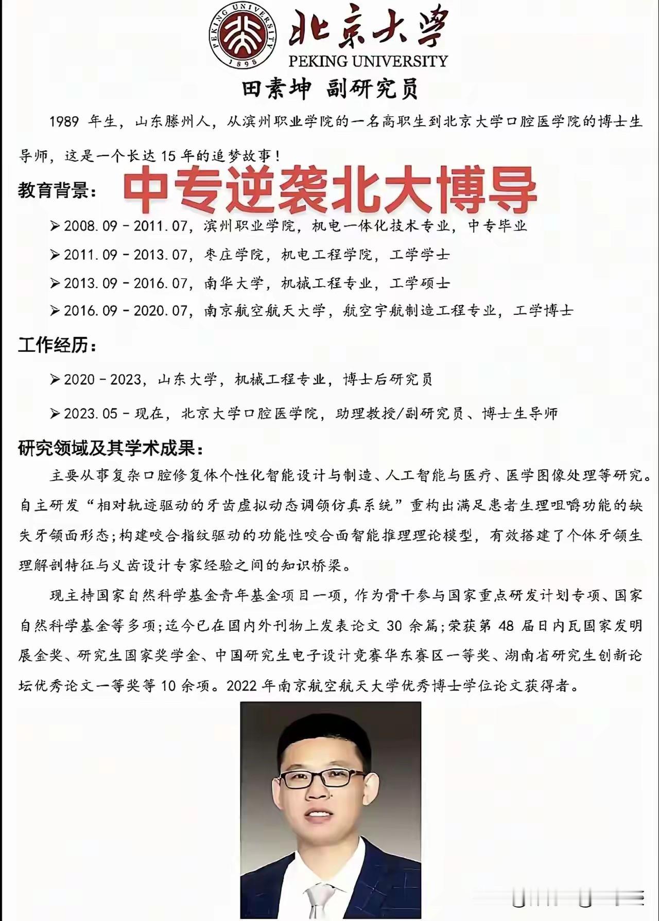 有的人开悟的早,有的人开悟的晚,有的人知道30多岁才意识到学历的重要性,有的人可能在十七八岁就知道了高考对于改变自己命运走向的重要性,这跟自己的家庭背景和父母的认知有很大的关系,如果你的父母属于高学历的,他们当然知道学历的重要性,他们可能很早就为你开始进行铺路,所以说我们看到很多考进清华北大的,其实人家的父母有的也是高知识阶层,高学历阶层,有父母的是大学老师,有的是中小学老师啊,有的是企业主,有的是商业版图做的很大,所以他们父母的眼光非常独到,这些小孩的话也比较自律,有的也继承了父母的优良基因,来自于贫困家庭的有的是被生活折磨的实在是没有办法了,只有读书是对他们来说是一条捷径,其他的话都是一种奢侈,现在这位田老师就属于晚知晚觉的,刚开始在高考的时候只考上了大专,但是后来经过一路的努力拼搏,当上了博生导师,而且是在北京大学,这非常了不起,非常励志,希望我们每个人处于人生低谷的人都不要放弃自己,要一路高升,往上走,不要怀疑自己的智力,先问你自己有没有足够的勤奋和刻苦!