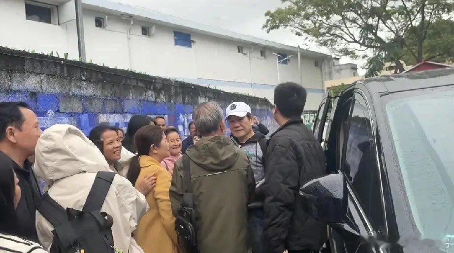 歌手赵传回广西崇左老家探亲,他来到龙茗镇龙英社区和亲戚亲切交谈,亲戚们搂着他的肩