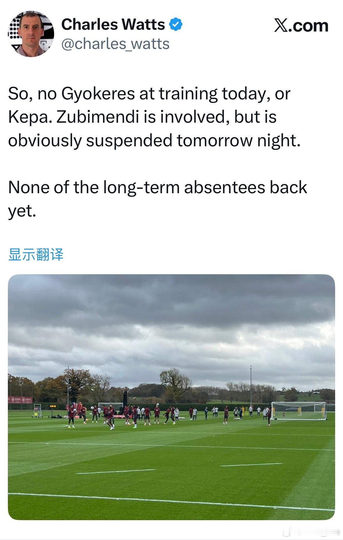 CharlesWatts:苏维门迪参与训练,哲凯、凯帕缺席。​​​