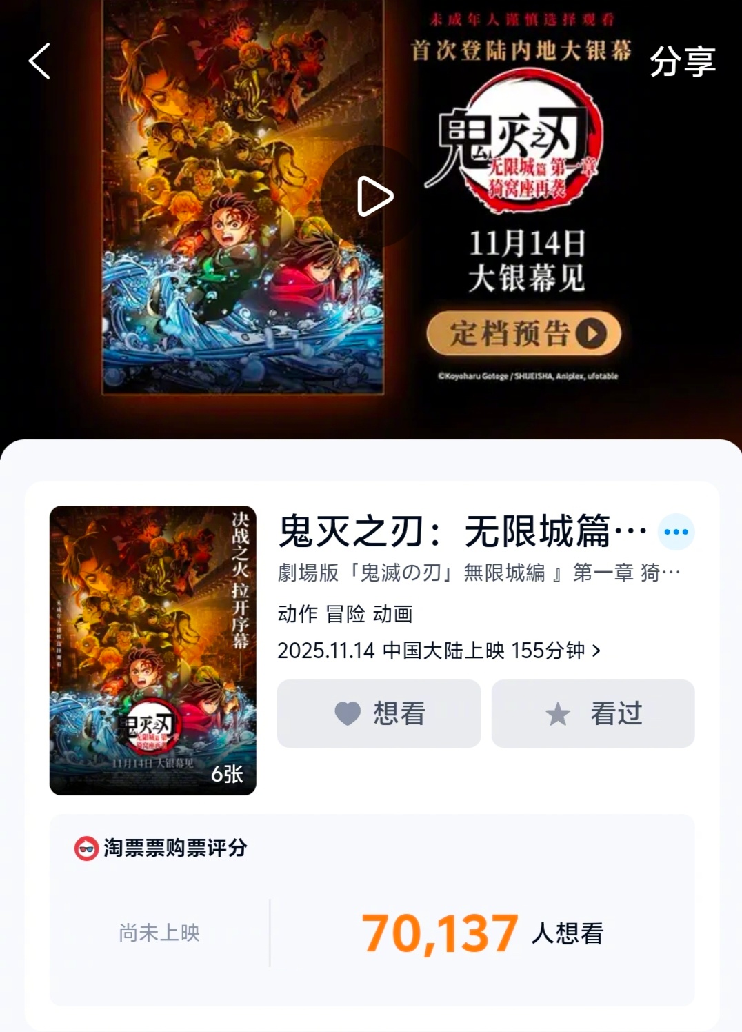 鬼灭之刃无限城篇定档 这个ip第一次知道,我是不是有点落伍了?小时候,我们也看《灌篮高手》,看《圣斗士》,长大后看川端康成、看渡边淳一、看春上村树,看东野圭吾。就是不知道有这的存在,现在必须要补下课了。