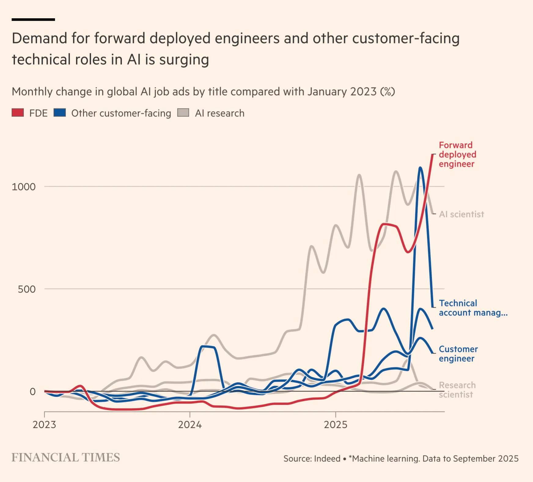 如今,AI 新创正仿效这套机制,OpenAI 也曾派出 FDE 为农机制造商 John Deere 客制化 AI 工具,协助农民将化学喷洒量减少六至七成,根据求职网站 Indeed 的数据,2025 年这类职缺的月度刊登数量暴增超过八倍。